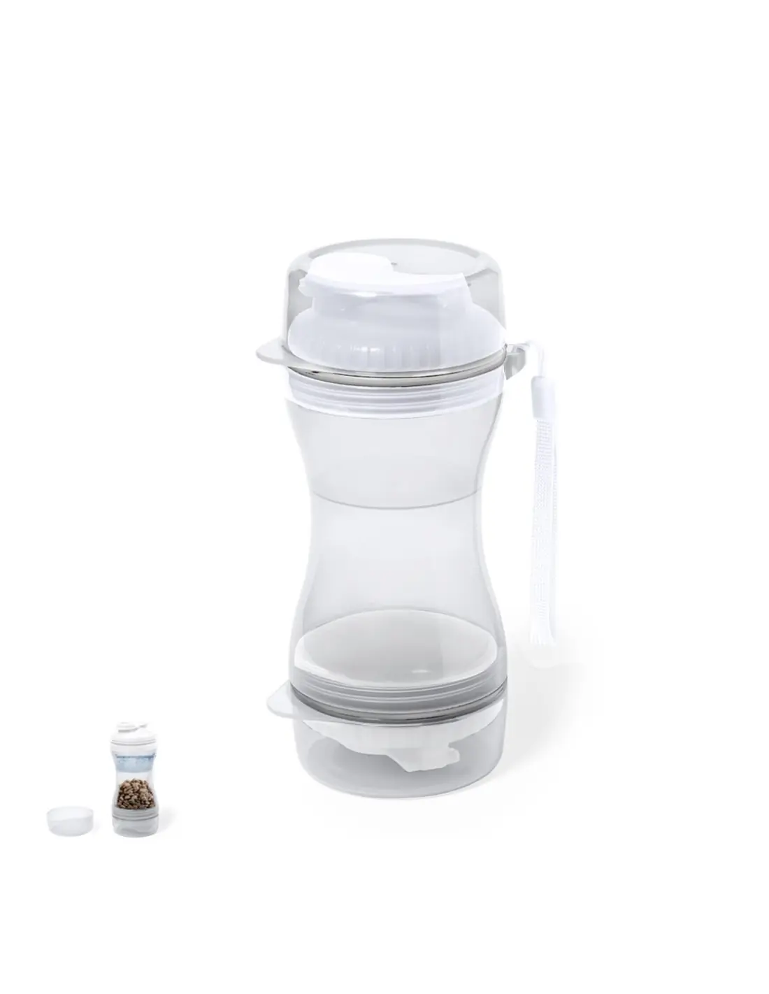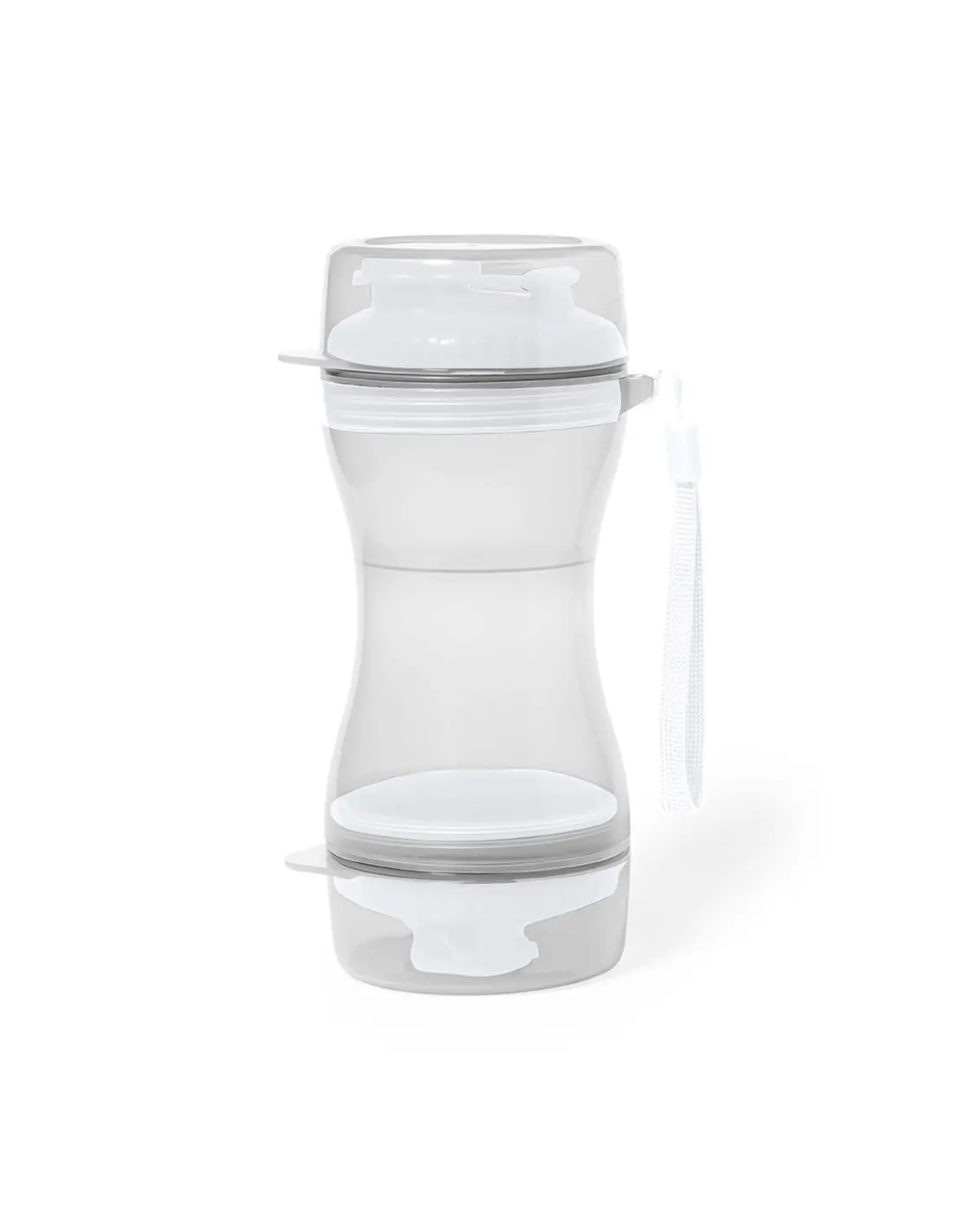 Práctico set de mascotas fabricado en resistente ABS. Con dos compartimentos separados de 330 ml y 280 ml, con tapón de rosca para mayor seguridad y dosificadores incluidos. Además, cuenta con dos tapaderas para usar como cuenco. Presentado individualmente en caja de diseño kraft.