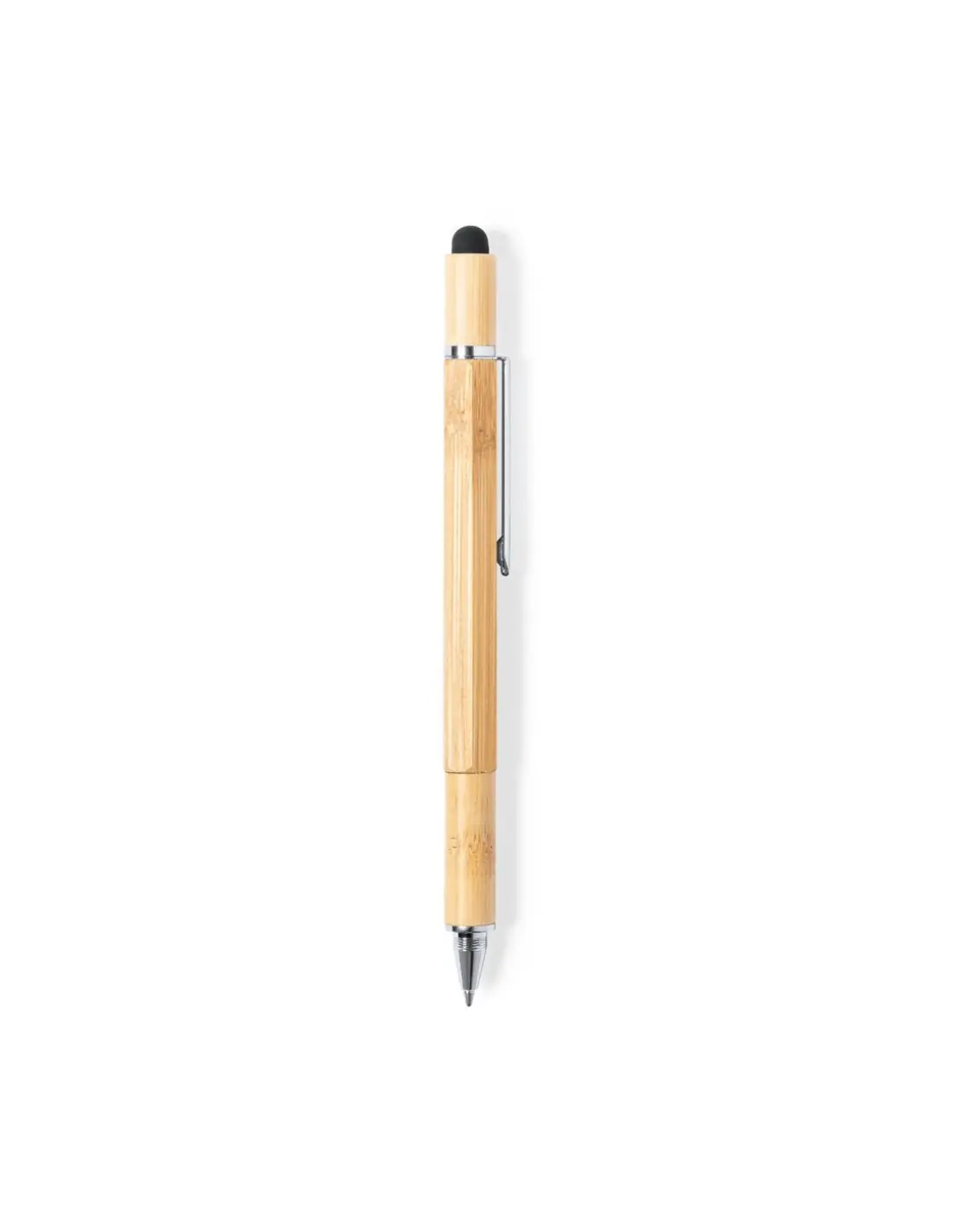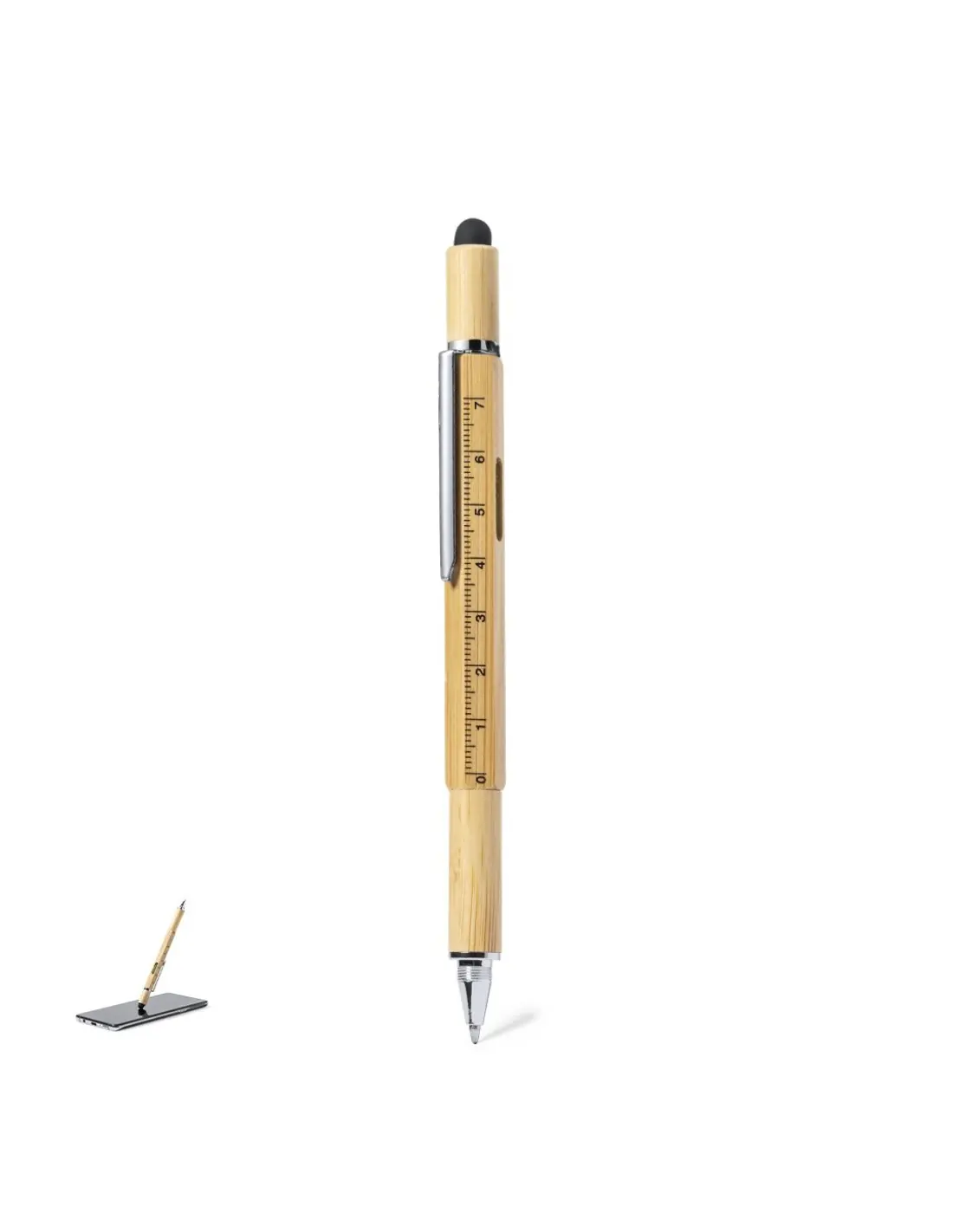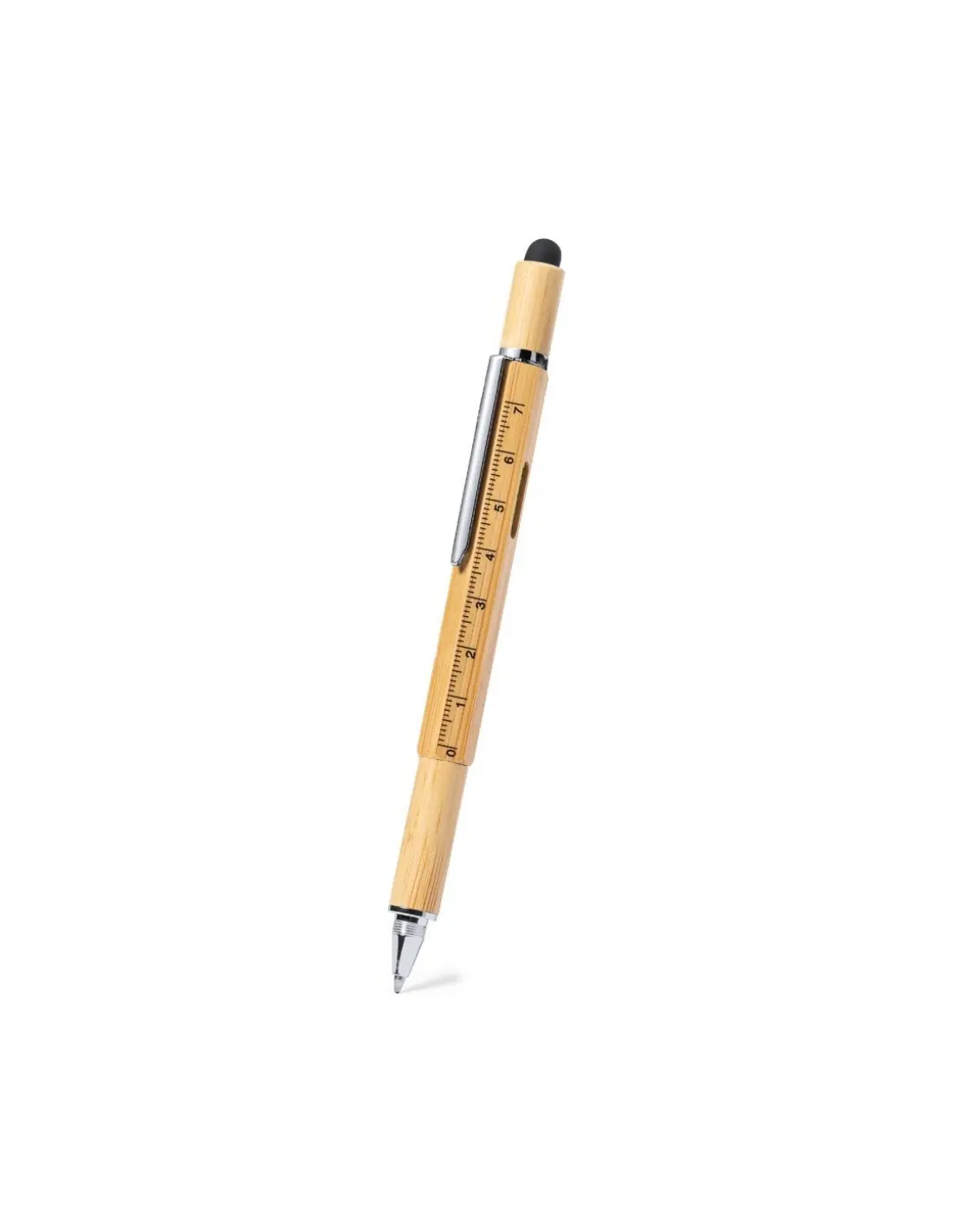 Bolígrafo multifunción de línea nature fabricado en bambú. De mecanismo giratorio y en tinta azul, con clip metálico y accesorios en cromado. Funciones bolígrafo, puntero táctil, destornillador plano y philips nivel y regla.