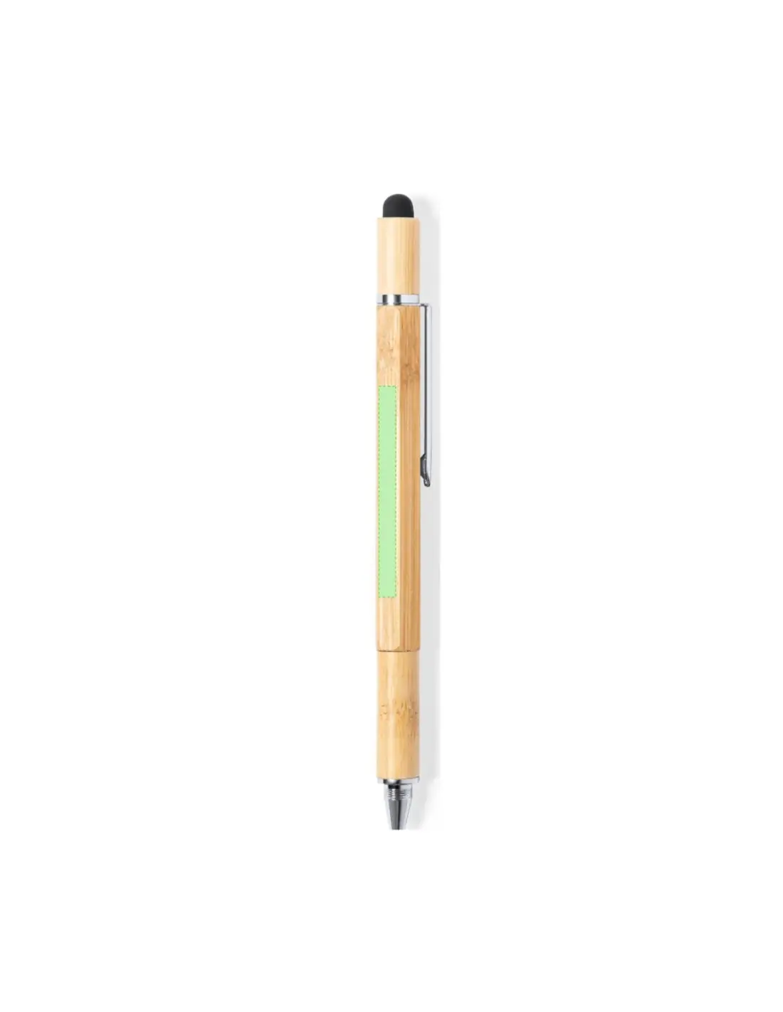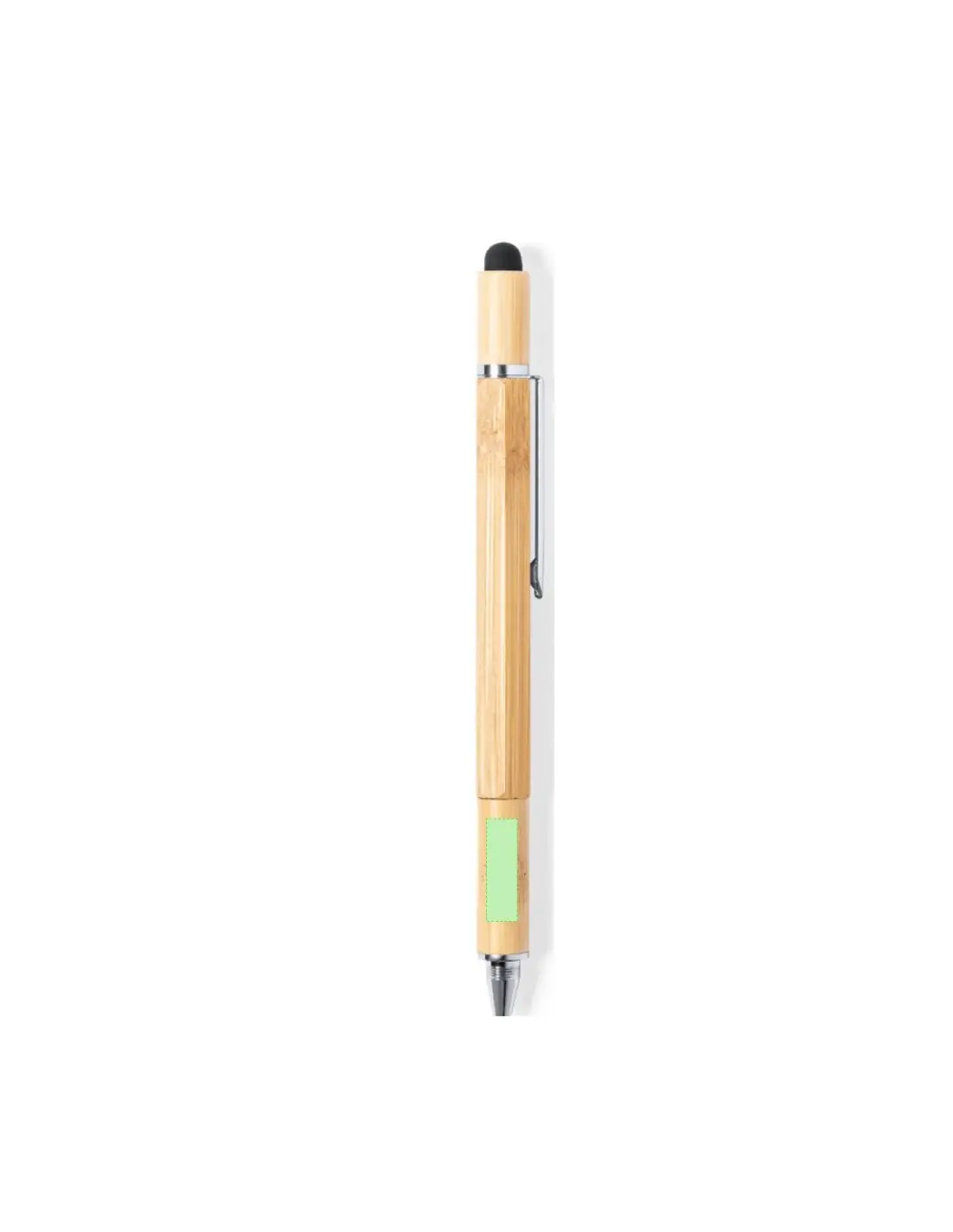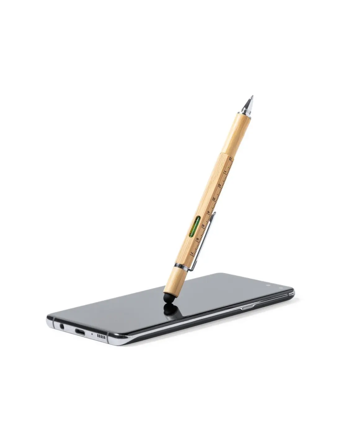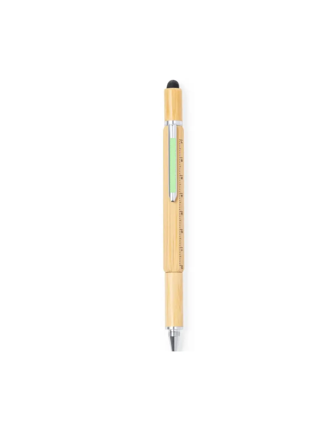 Bolígrafo multifunción de línea nature fabricado en bambú. De mecanismo giratorio y en tinta azul, con clip metálico y accesorios en cromado. Funciones bolígrafo, puntero táctil, destornillador plano y philips nivel y regla.