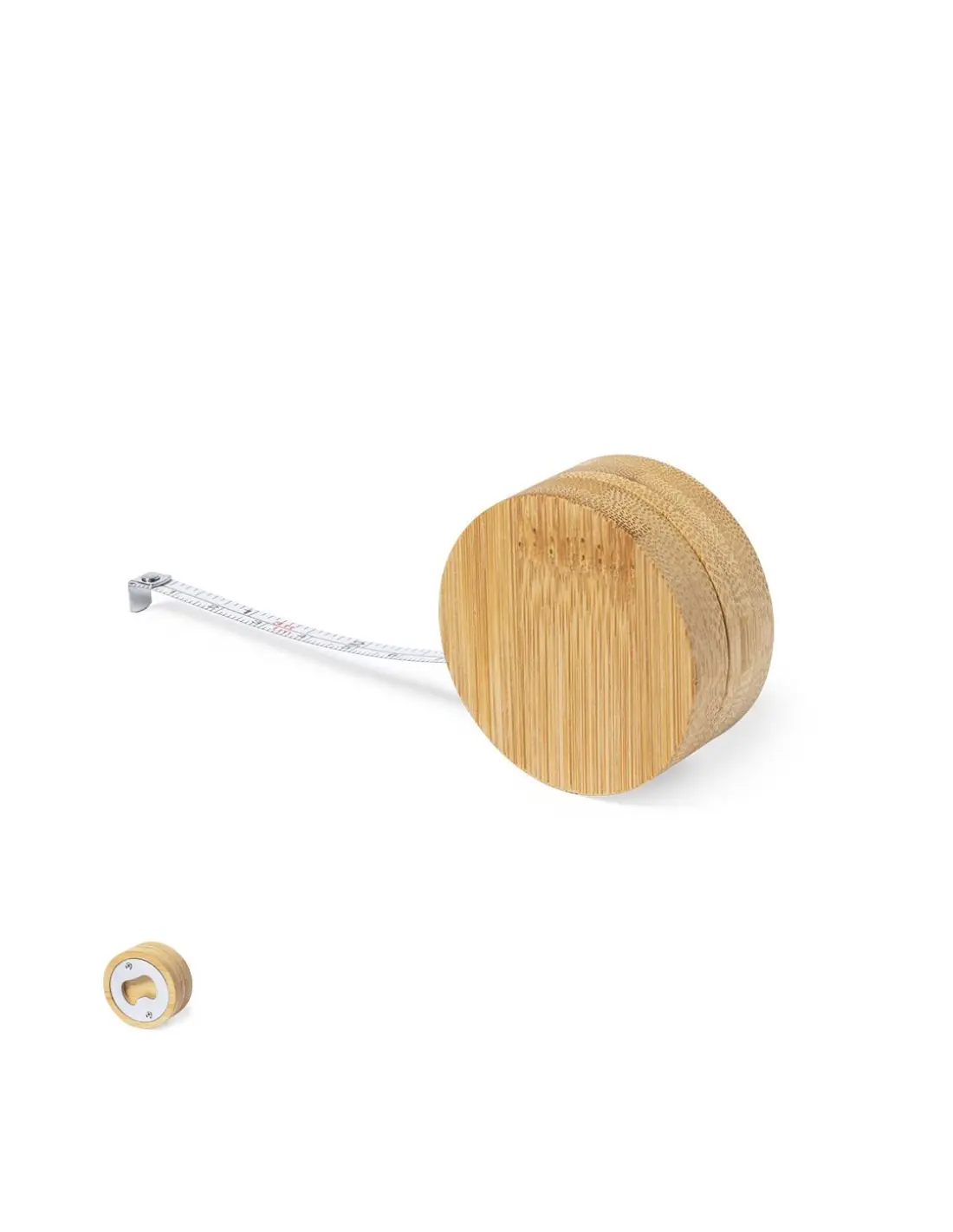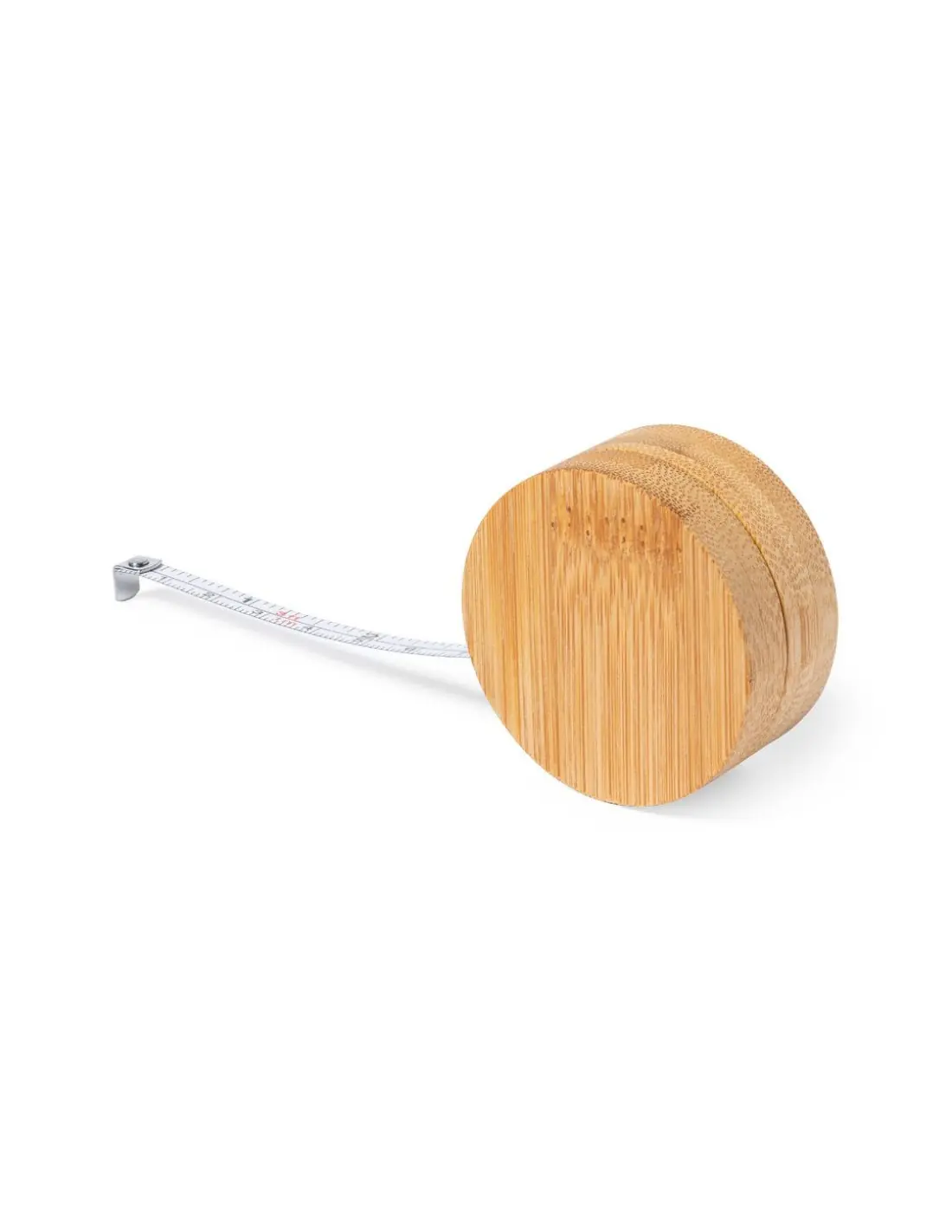 Flexómetro 1 m de línea nature fabricado en bambú, con abridor metálico integrado. Hoja con medidas en centímetros y pulgadas.