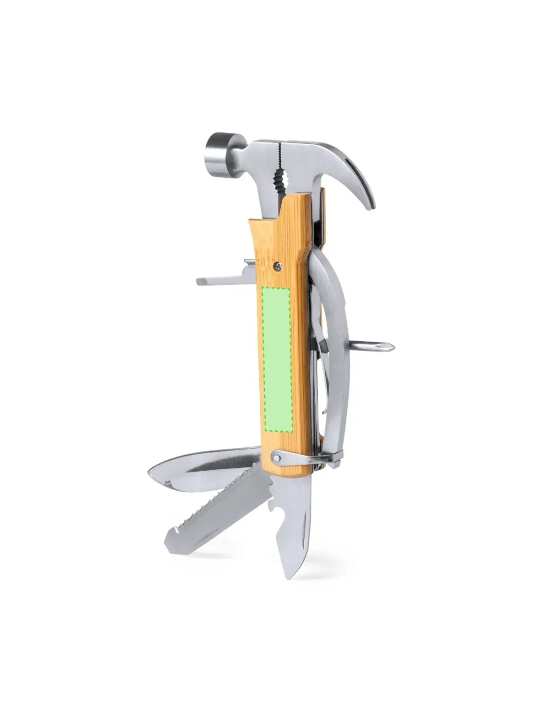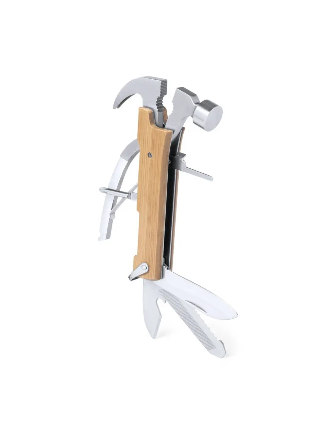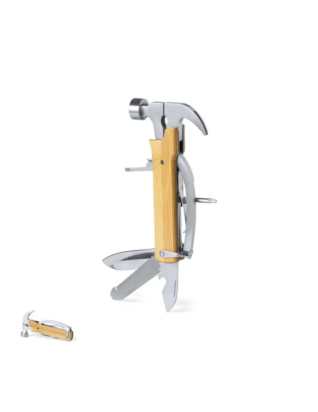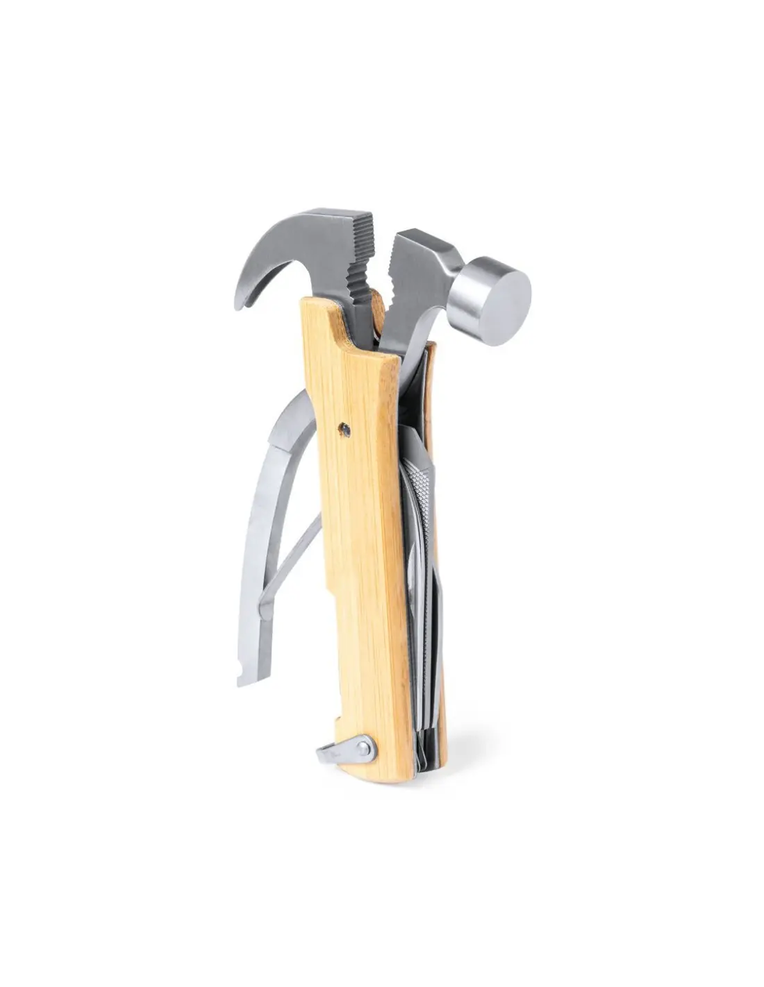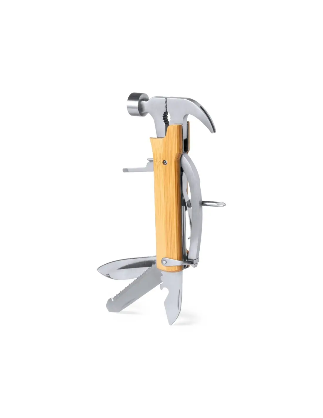 Multiherramienta de línea nature, con resistente cuerpo en acero inox y empuñadura de bambú. Con 13 funciones, entre otras martillo y sacaclavos...