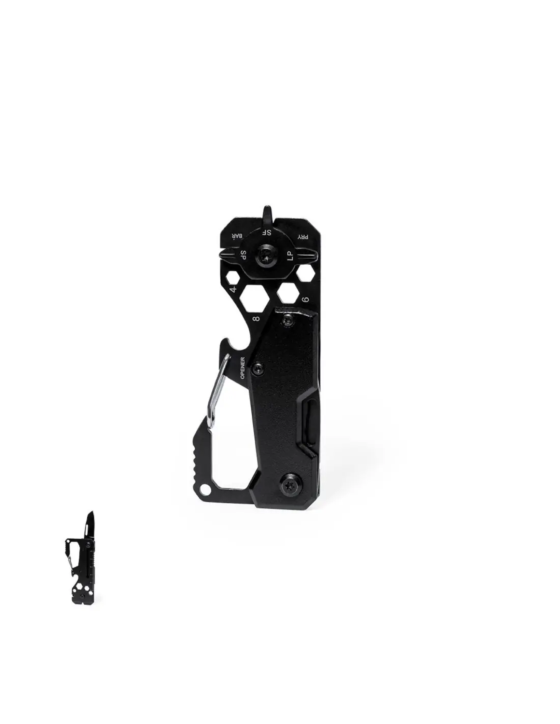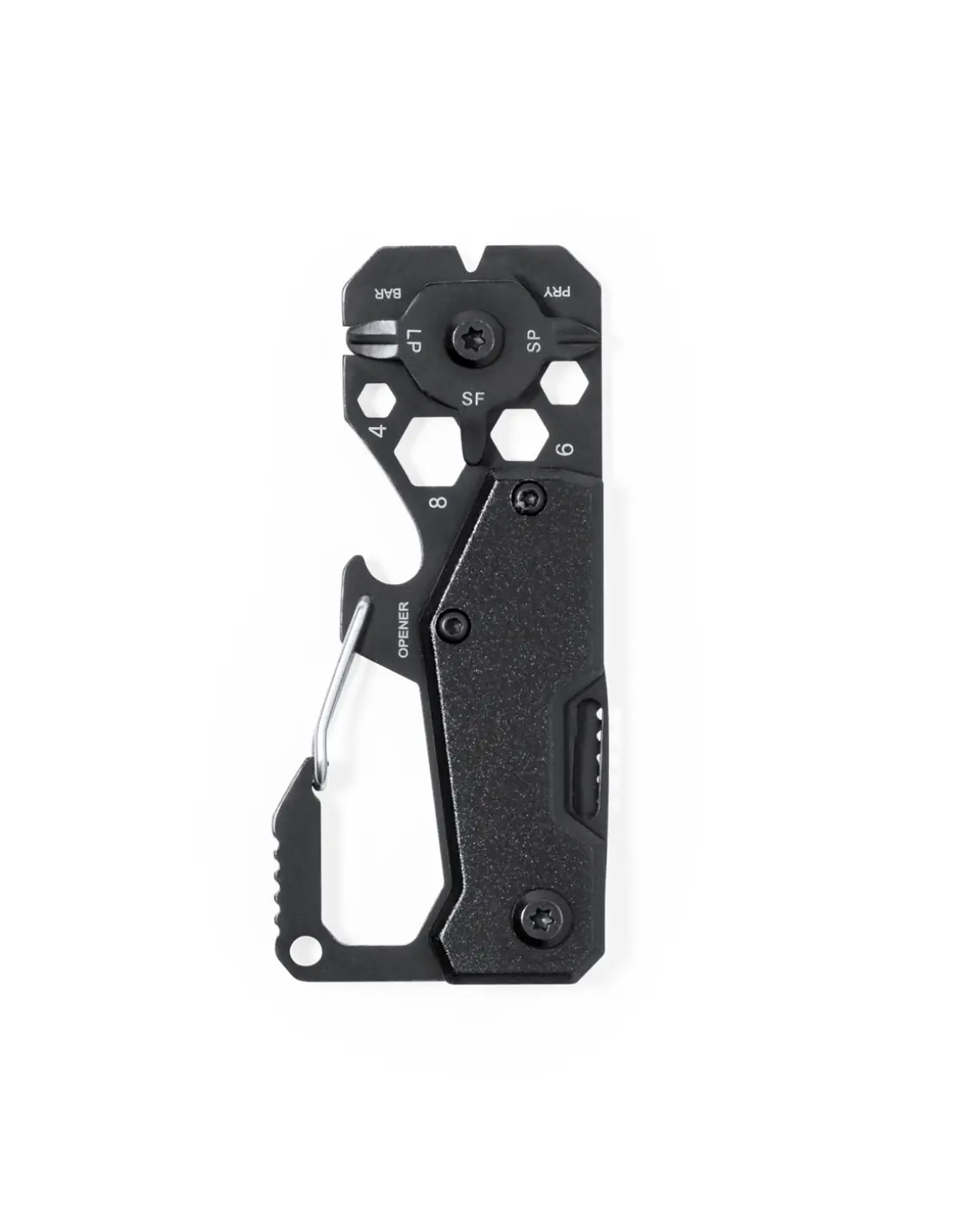 Excelente multiherramienta fabricada en aluminio y acero inox con acabado en color negro. Incluye 13 funciones diferentes: llave para tuercas hexagonales en varios tamaños, mosquetón, abrelatas, regla, rasqueta, cuchillo, destornilladores planos y philips. Presentada en caja de diseño kraft.