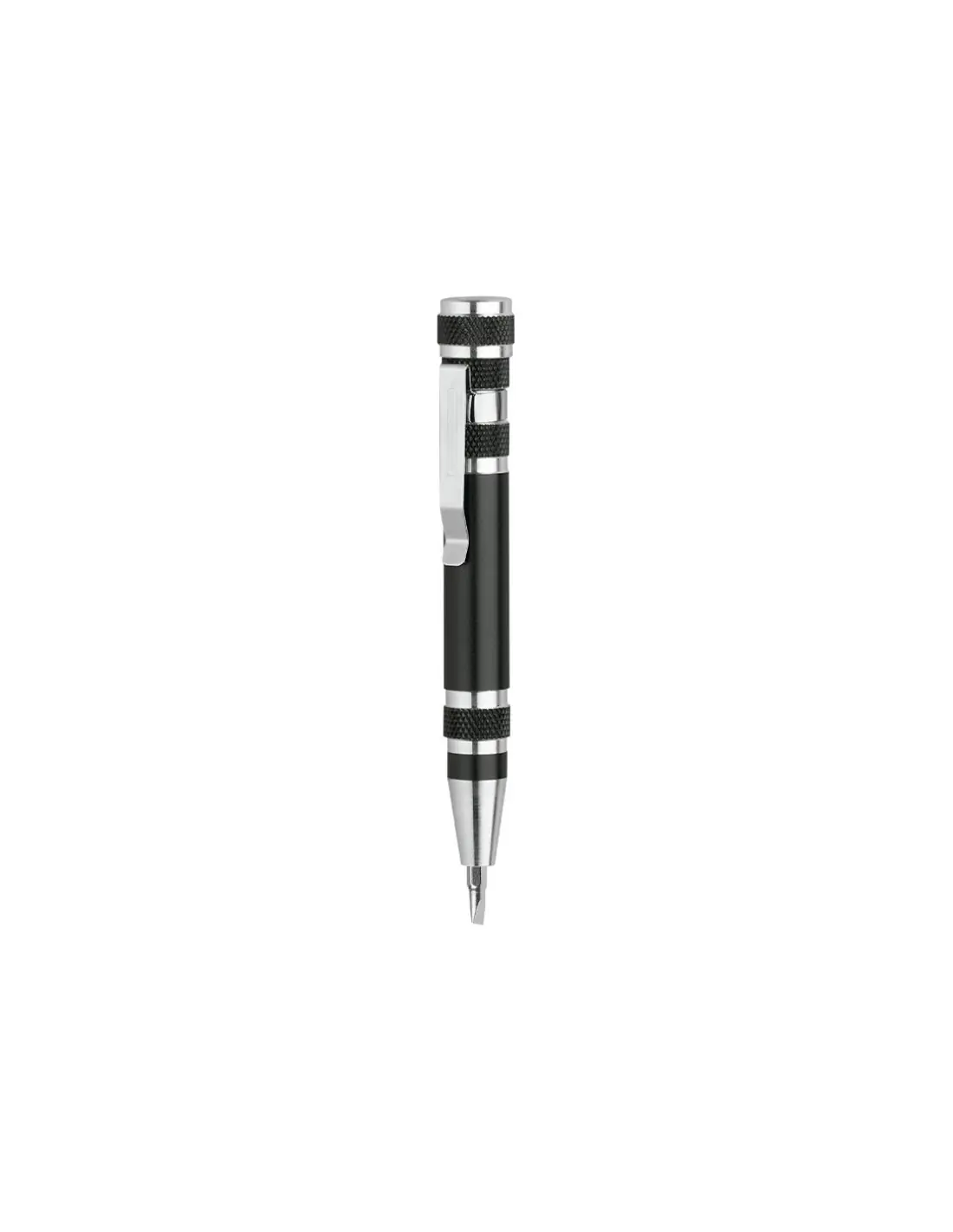 Multiherramienta de aluminio de 6 accesorios en variada gama de vivos colores metalizados. Con cuerpo anti deslizante y clip metálico. Incluye 6 cabezales destornilladores planos y de estrella.