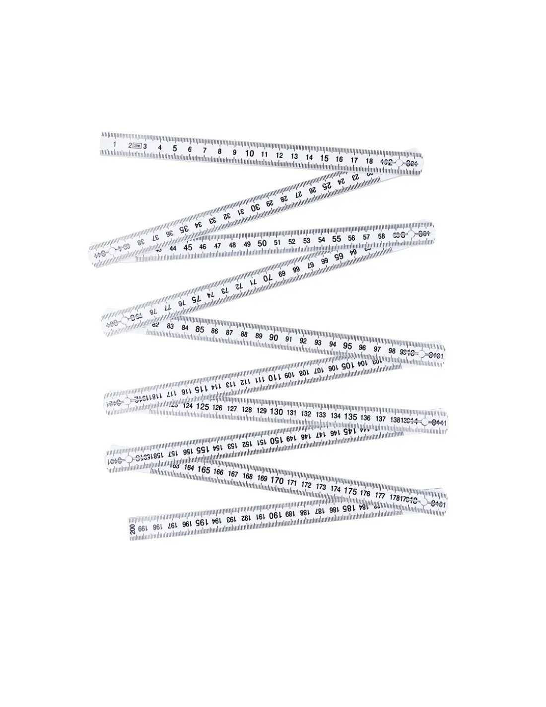 Regla plegable de 2 metros en resistente fibra de vidrio. Con escala en centímetros de color negro visible por ambas caras. Con posiciones posiciones ajustables a 90º, 180º y 270º para mayor versatilidad.