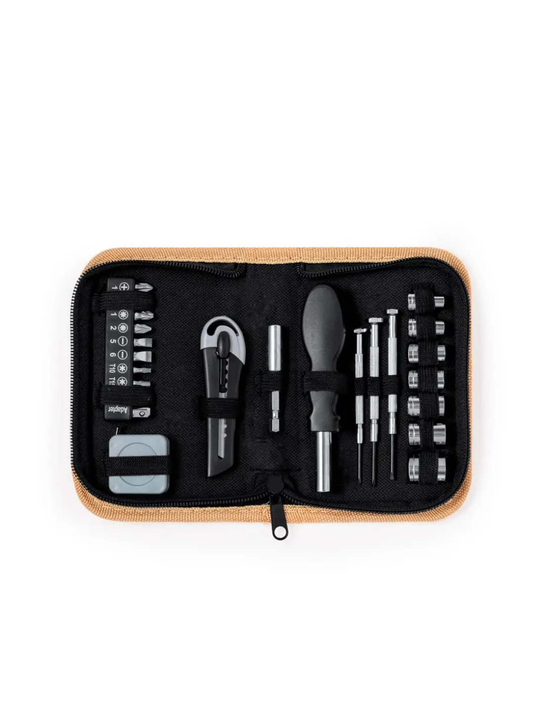 Set de herramientas de 24 accesorios en estuche de corcho con interior ordenado por elásticos. Incluye llaves de tubo, destornilladores de precisión (plano y philips), mango multifunción con diversas puntas intercambiables (extensión, cabezales philips, planos, de estrella y adaptador), cúter y un metro. Presentado en caja de diseño kraft.Elaborado con elementos vegetales para así fomentar la utilización de materias primas naturales y reducir las emisiones contaminantes.