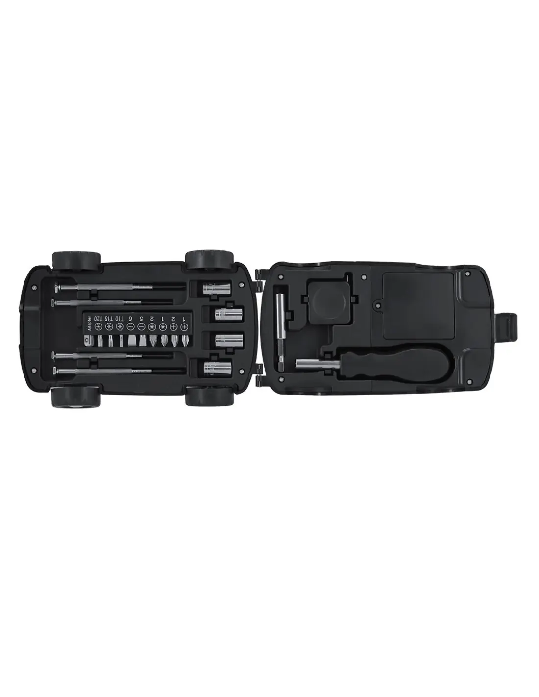 Set de herramientas con estuche en forma de coche y linterna LED. Con 20 herramientas. Incluye: - Set de destornilladores de precisión (planos y philips)- Herramienta de fijación- Mango multifunción con cabezales de destornilladores planos y de estrella-Llaves para tuercas de cabeza hexagonal-FlexómetroCon linterna con 2 LEDs integrada en el escuche, alimentada por 4 pilas AAA (no incluidas).