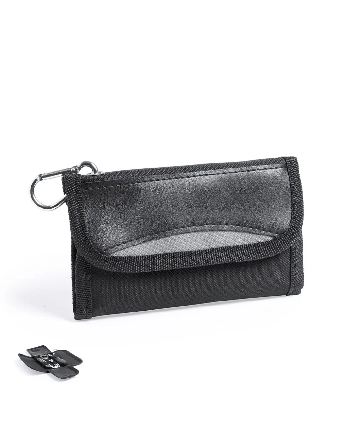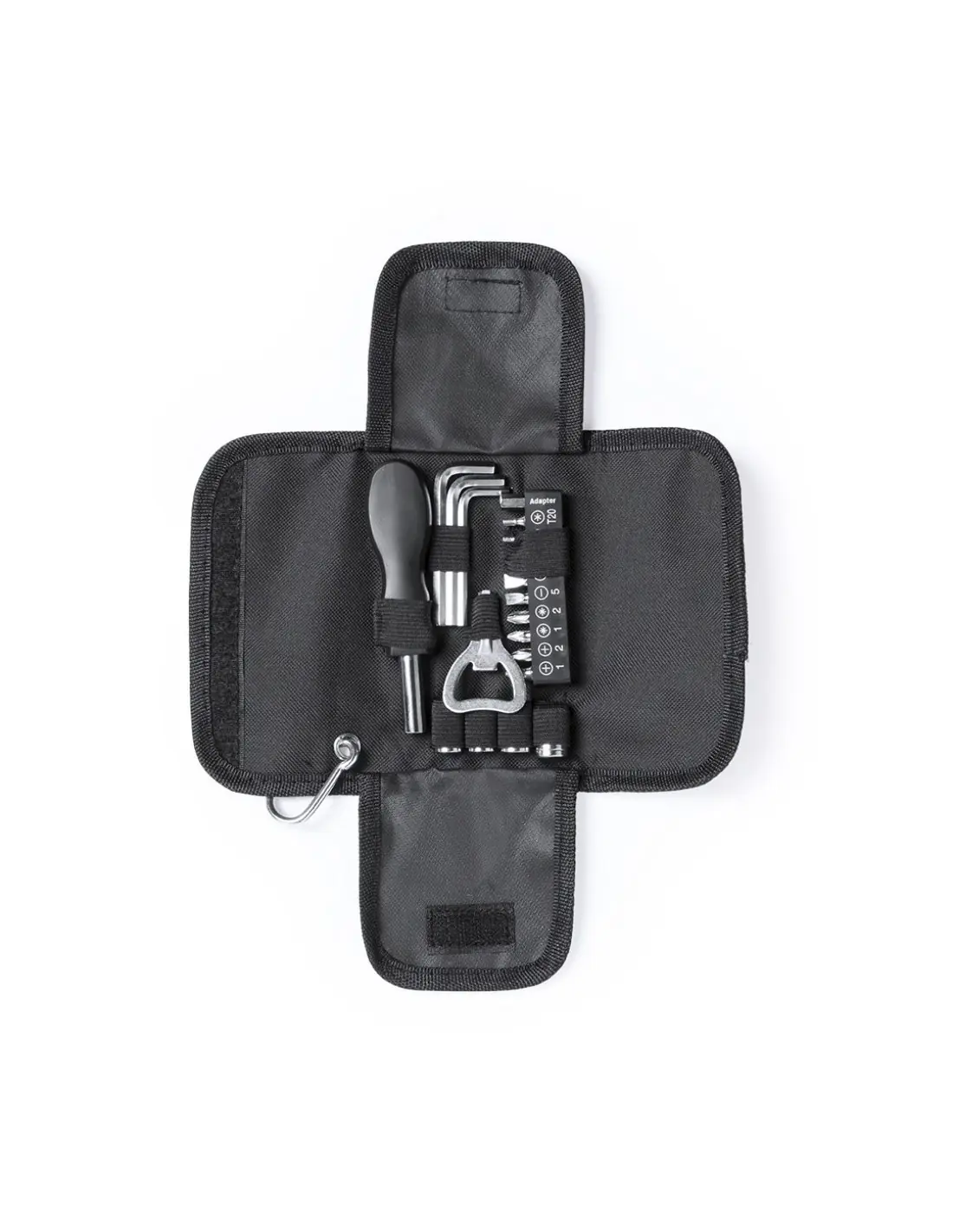 Set de herramientas de 19 accesorios en resistente estuche de poliéster con cierre de cremallera. Incluye herramienta de fijación, cabezales destornilladores planos, de estrella y tipo torx, set de llaves tipo allen, llaves para tuercas de cabeza hexagonal y abridor. Con mosquetón metálico de transporte.