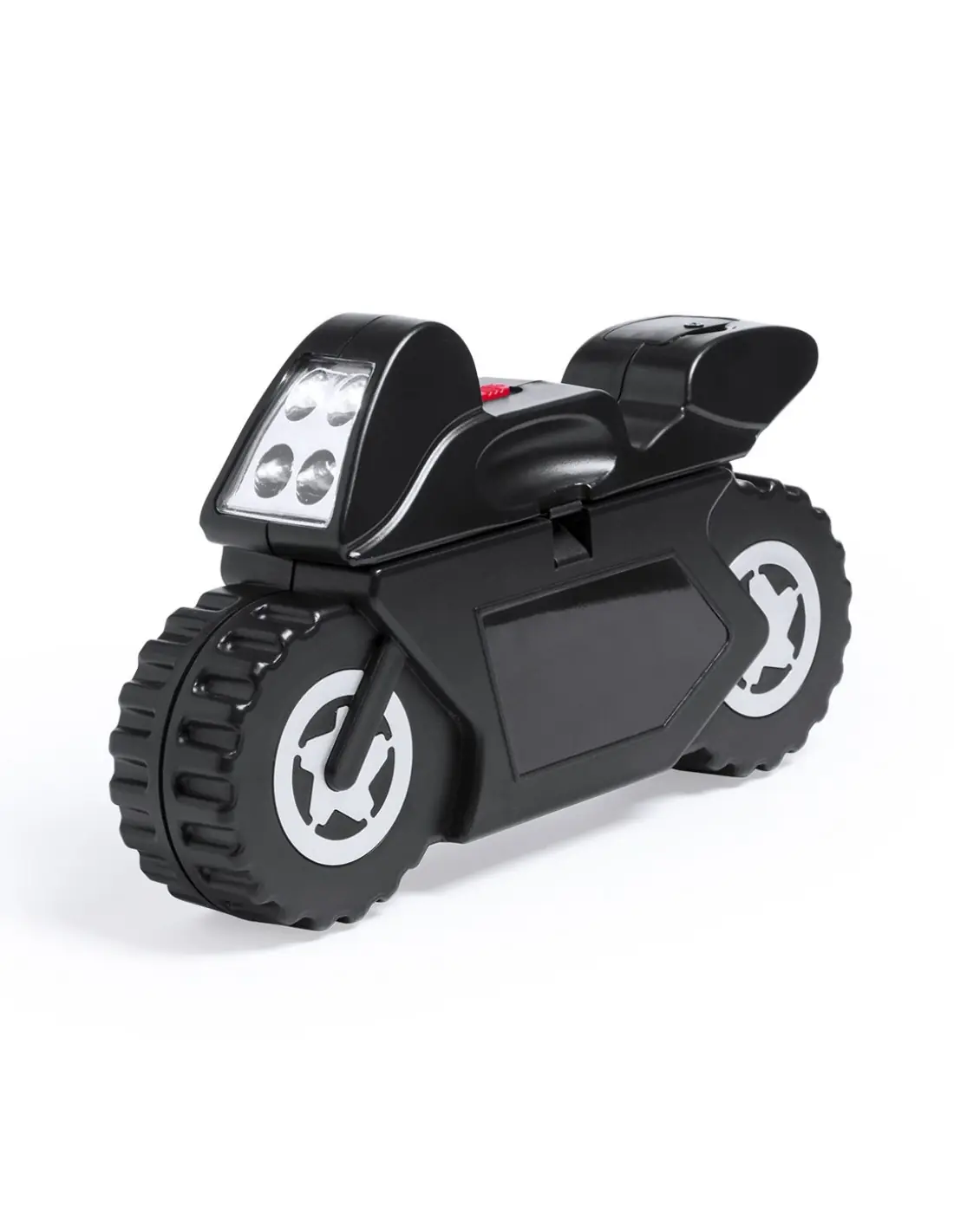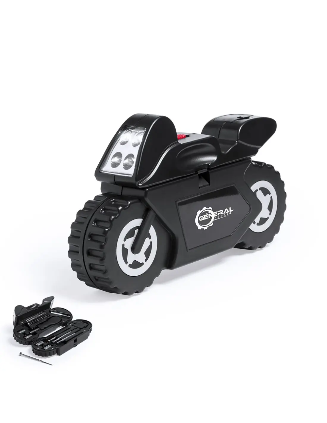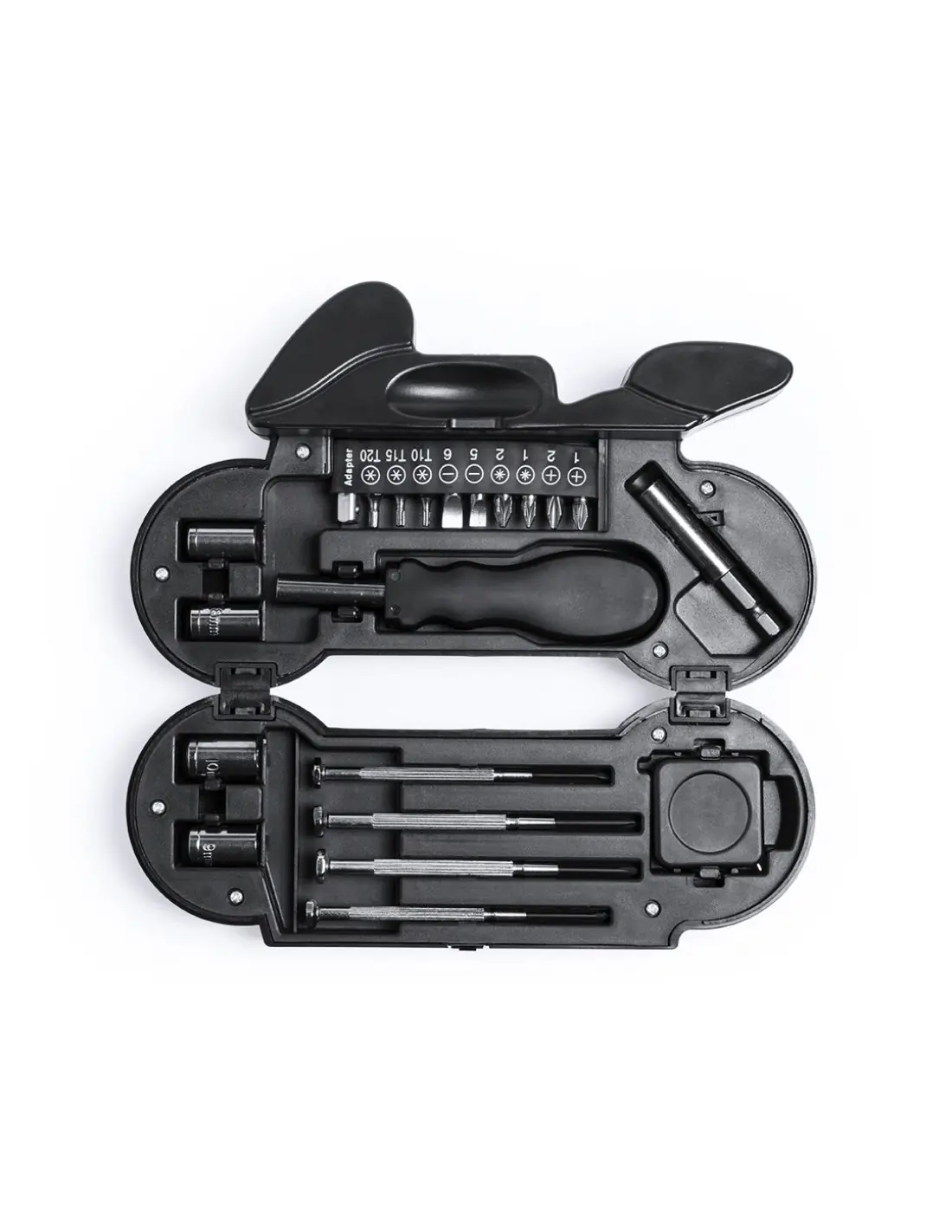 Set de herramientas de 14 accesorios en resistente estuche con diseño de moto, con linterna de 4 ledes integrada. Incluye set de destornilladores de precisión, herramienta de fijación, cabezales destornilladores planos y de estrella y llaves para tuercas de cabeza hexagonal. Pilas de botón incluidas. Presentado en caja individual.