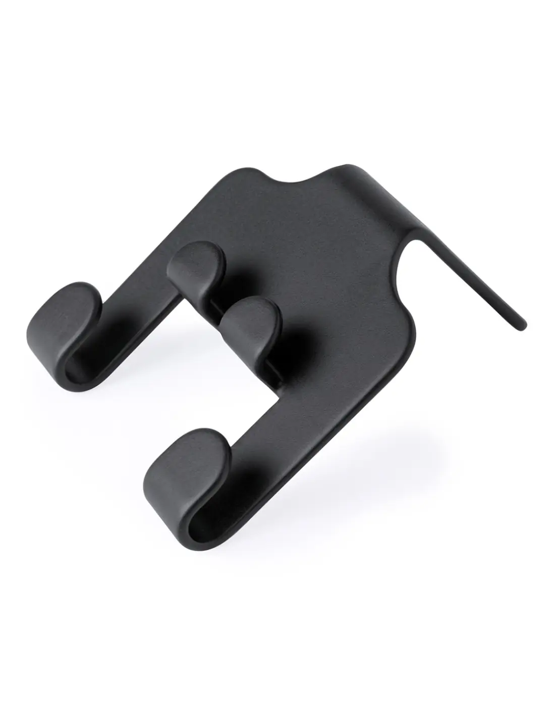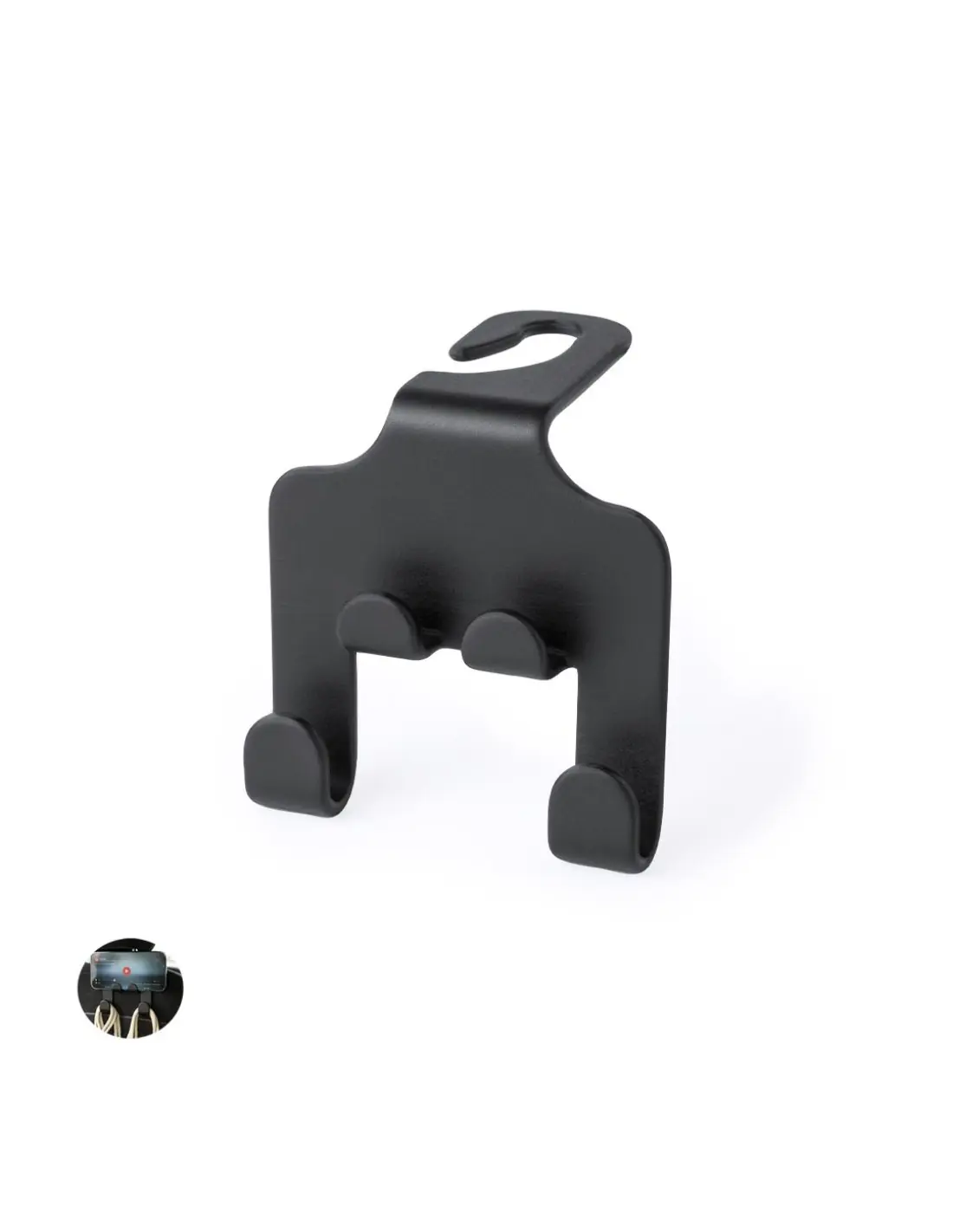 Resistente soporte fabricado en ABS. Fácil instalación mediante el gancho abierto diseñado para colocarse en el reposacabezas, con soporte para dispositivos móviles y dos ganchos adicionales para bolsas. Presentado en bolsa individual.
