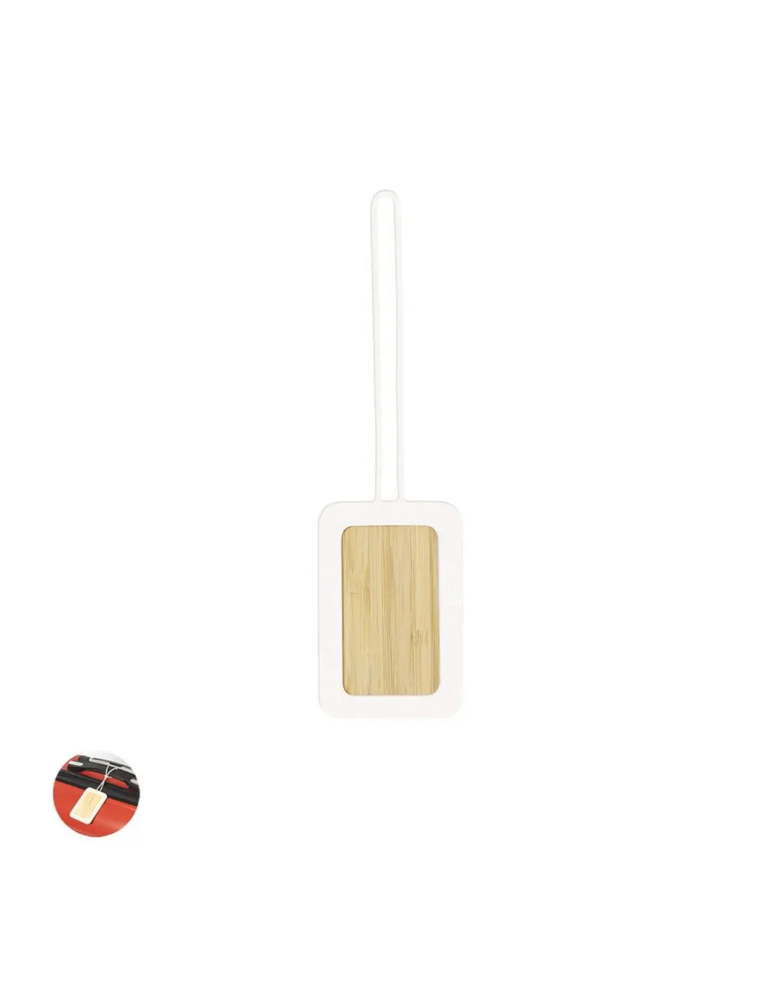 Identificador para maletas fabricado en bambú y silicona veteada. Para sujetar a cualquier maleta gracias a su cinta flexible e indicar información...