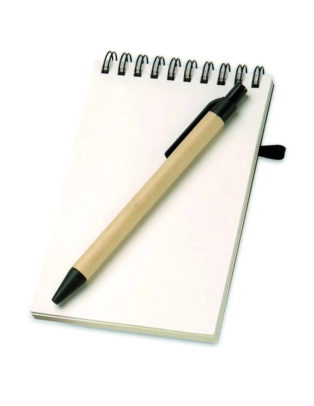 Libreta de bolsillo A6 con 70 hojas de papel reciclado. Incluye bolígrafo de tinta azul reciclado con piezas de plástico biodegradable FSC®-certifi…