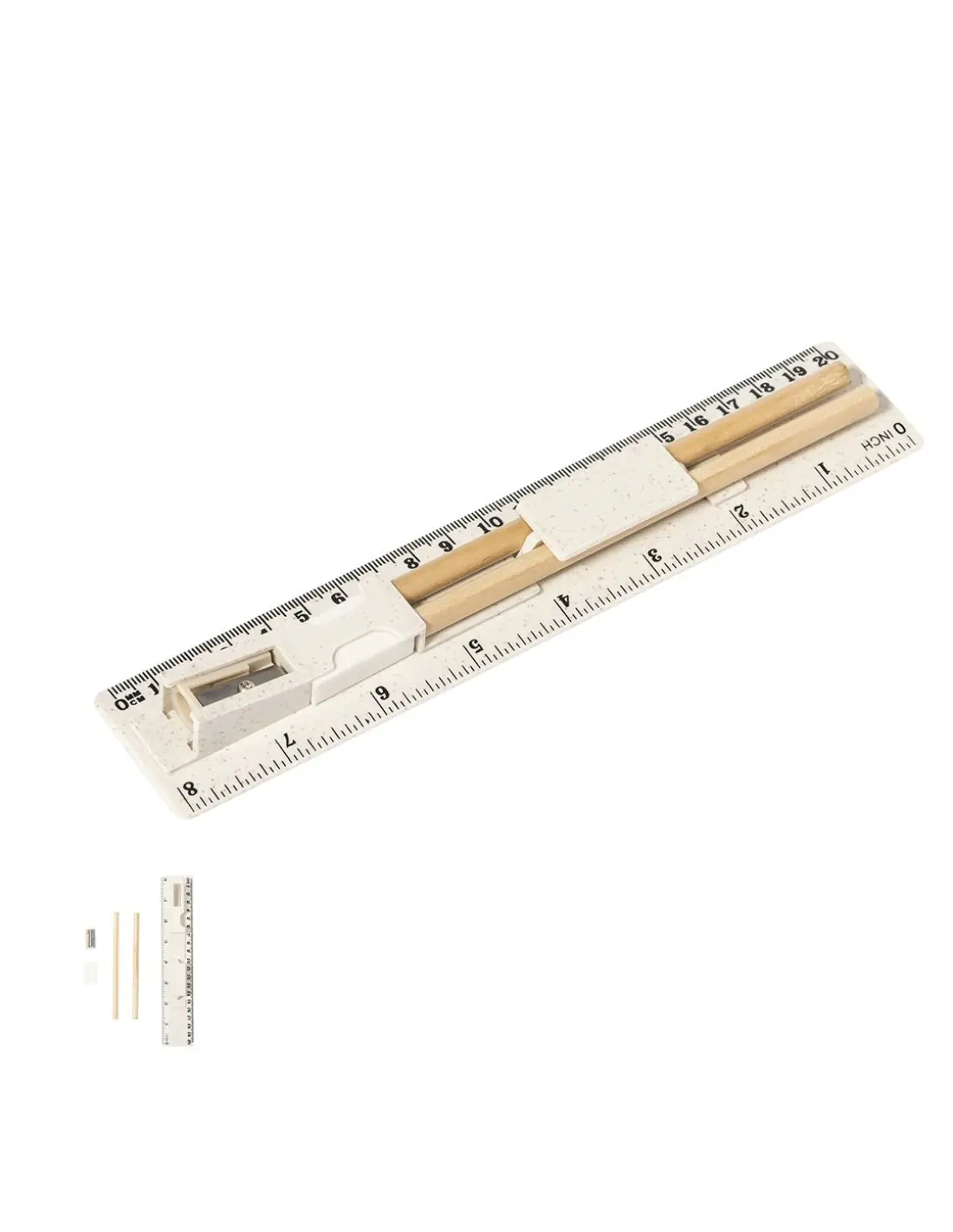 Set de 5 piezas fabricado en caña de trigo. Incluye 2 lápices de madera con mina negra y cuerpo cilíndrico blanco; goma y sacapuntas. Presentado en estuche/regla de 20 cm/8 pulgadas, con compartimentos para los distintos elementos del set. Presentado individualmente en una bolsa de papel blanca. La caña de trigo fomenta la utilización de materias primas naturales, reduciendo así las emisiones contaminantes.