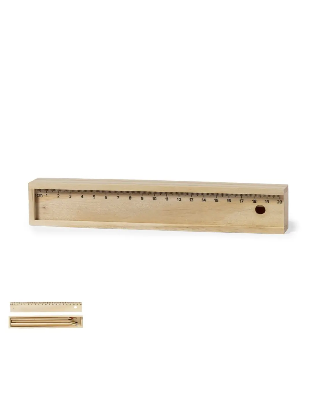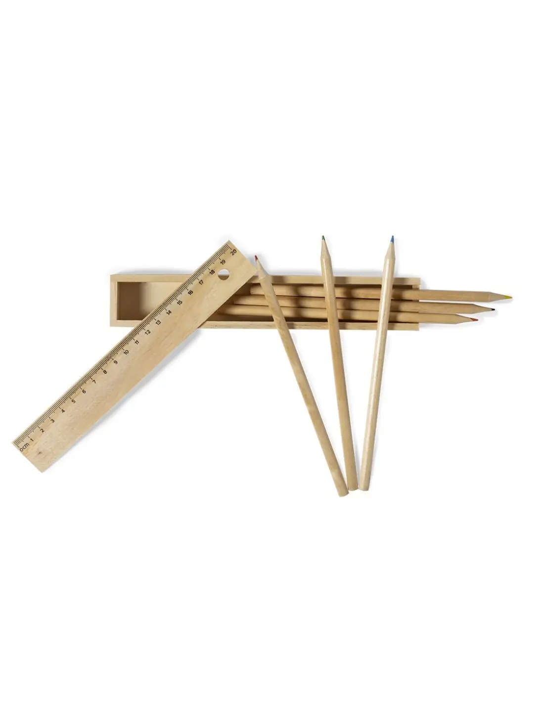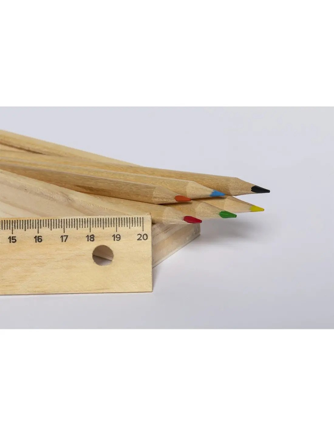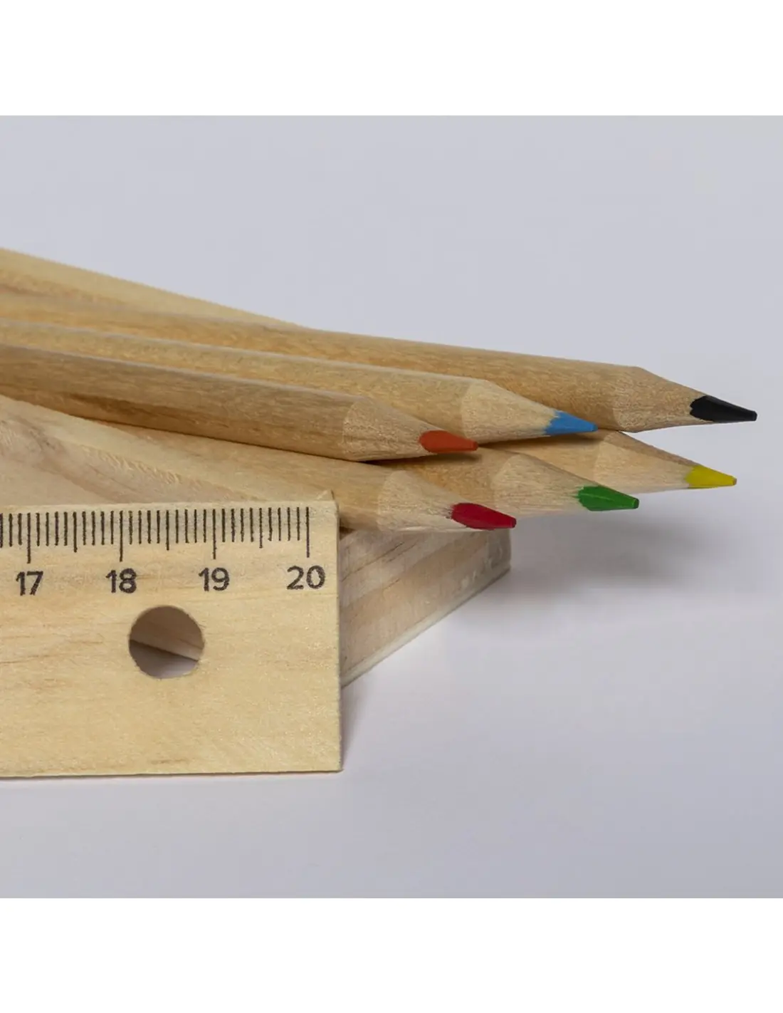 Set de 6 lápices en estuche de madera natural. Lápices en madera, con cuerpo redondo de acabado natural y minas en colores variada gama de vivos colores. Tapa de cierre anti deslizante con regla integrada de 20cm.