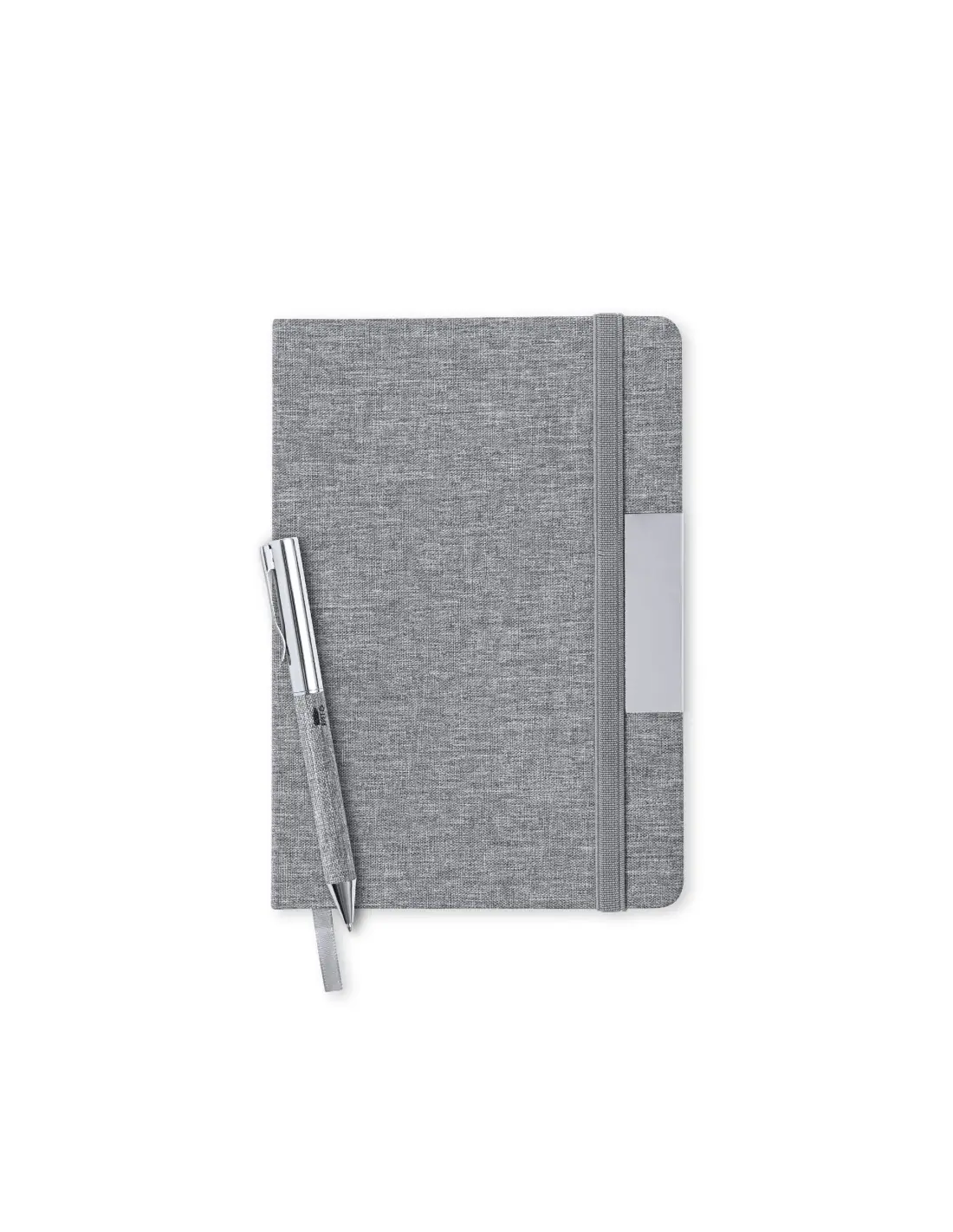 Set de bloc de notas y bolígrafo en RPET, elaborado a partir de plástico reciclado para así fomentar la reutilización de residuos plásticos y ayudar a la sostenibilidad del planeta. Incluye: Bloc de notas de tapas rígidas, con detalle metálico en la portada, marcapáginas de tela y elástico de sujeción a juego. 100 hojas interiores con disposición a una raya y distintivo RPET.Bolígrafo fabricado en metal cromado y con cuerpo recubierto en poliéster RPET. Elegante clip metálico y accesorios a juego, de mecanismo giratorio y en tinta azul. Con distintivo RPET en cuerpo.Set presentado en elegante estuche de diseño en color negro, con compartimento independiente para bloc de notas y bolígrafo.