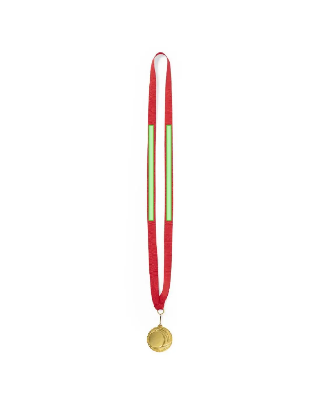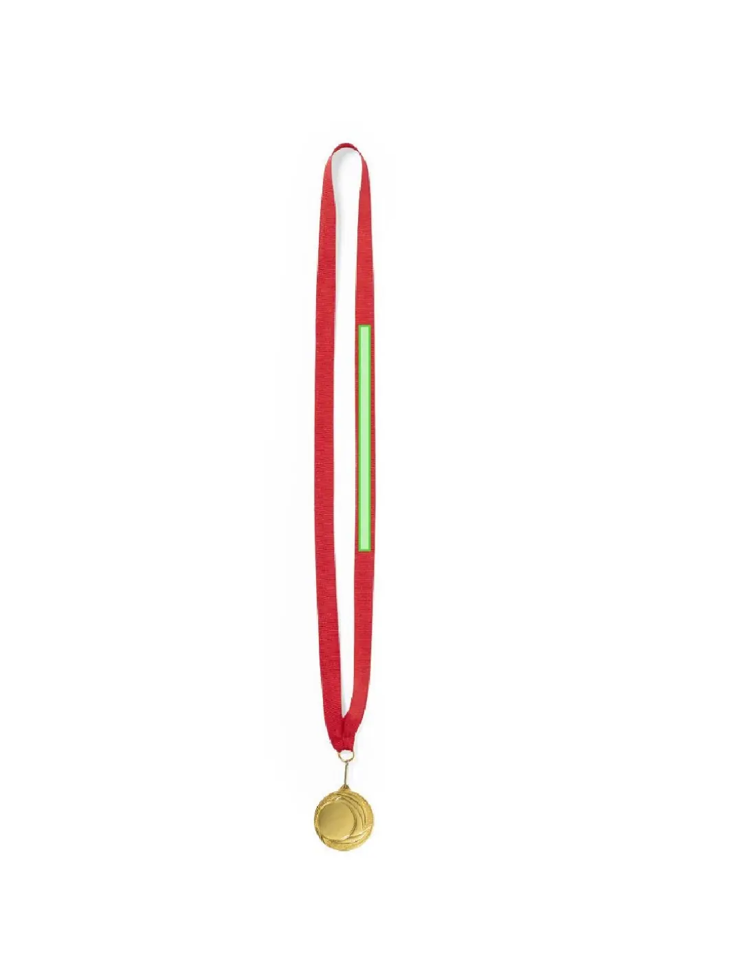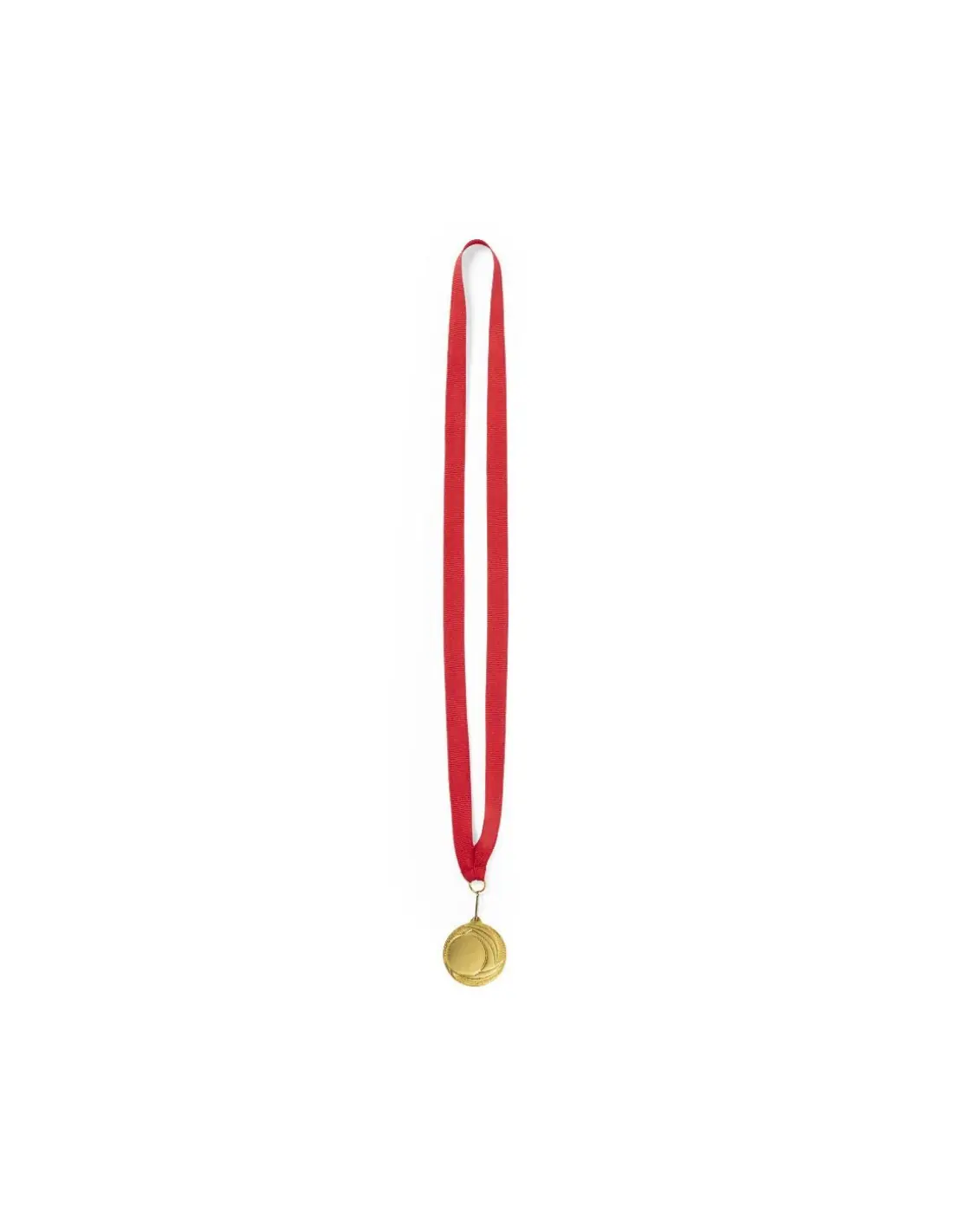 Medalla metálica de acabado dorado en relieve. Con cinta de poliéster en rojo, mosquetón metálico a juego y especialmente diseñada para marcaje en láser.