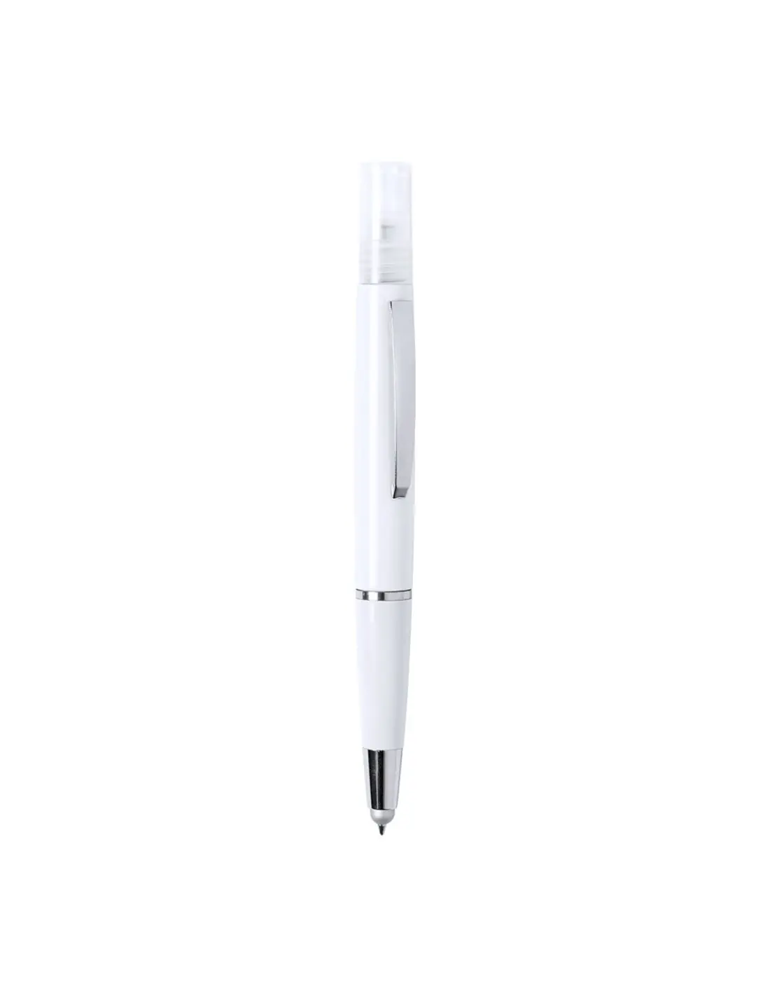 Bolígrafo antibacteriano con pulverizador recargable integrado y capucha protectora, incluye puntero en color gris. Acabado liso en resistente ABS brillante con elegante clip metálico y escritura en tinta azul. Capacidad del pulverizador 3ml. Líquido no incluido.Los productos con tratamientos antibacterianos son capaces de reducir drásticamente las cargas bacterianas presentes en las superficies de los materiales, gracias a la incorporación de agentes microbianos permanentes estáticos, con alta efectividad para inhibir y prevenir la contaminación bacteriana.Artículo de acuerdo al estándar ISO 22196, que determina la actividad antibacteriana en materiales plásticos y superficies no porosas, lo que permite conocer la efectividad de inhibición microbiana que tienen los aditivos sobre los objetos tratados mediante una evaluación cuantitativa.