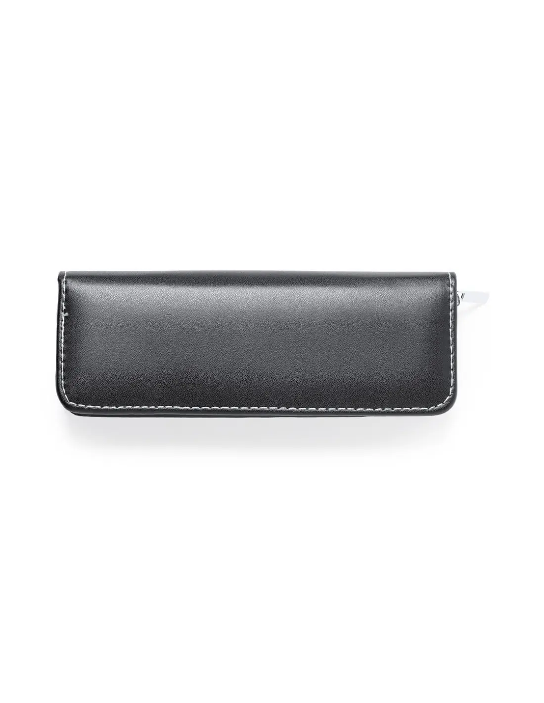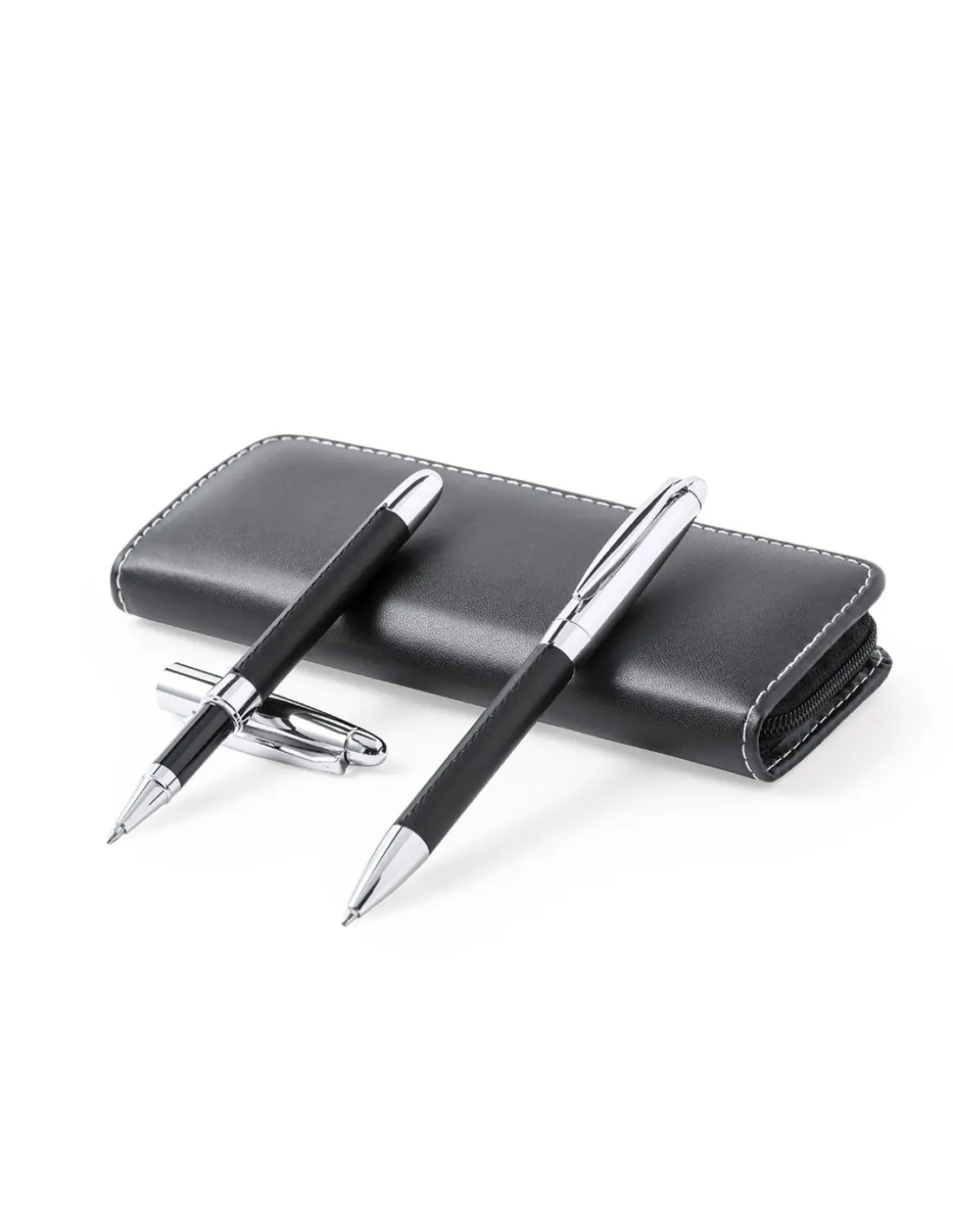 Set premium de bolígrafo y roller. Fabricado en elegante combinación de polipiel en tonos negros y metal cromado. Bolígrafo de mecanismo giratorio en tinta azul y con cartucho jumbo. Roller con capucha y tinta gel en azul, carga jumbo. Presentado en estuche individual de polipiel con cierre de cremallera e interior a juego con compartimentos individuales.