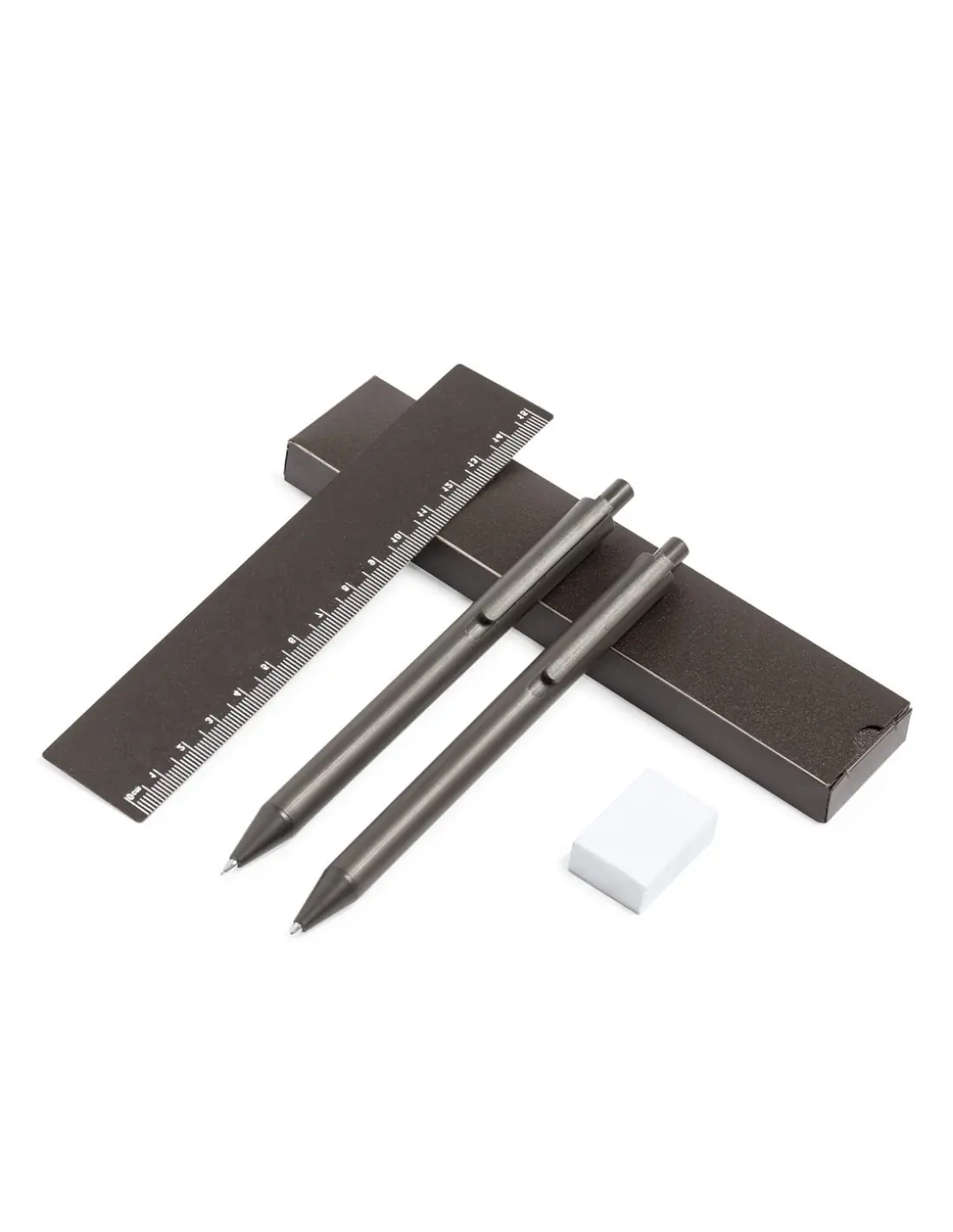 Set de bolígrafo, portaminas y regla, fabricados en fibra de café. Bolígrafo en tinta azul y portaminas con 2 minas incluidas de 0,7mm, ambos con...