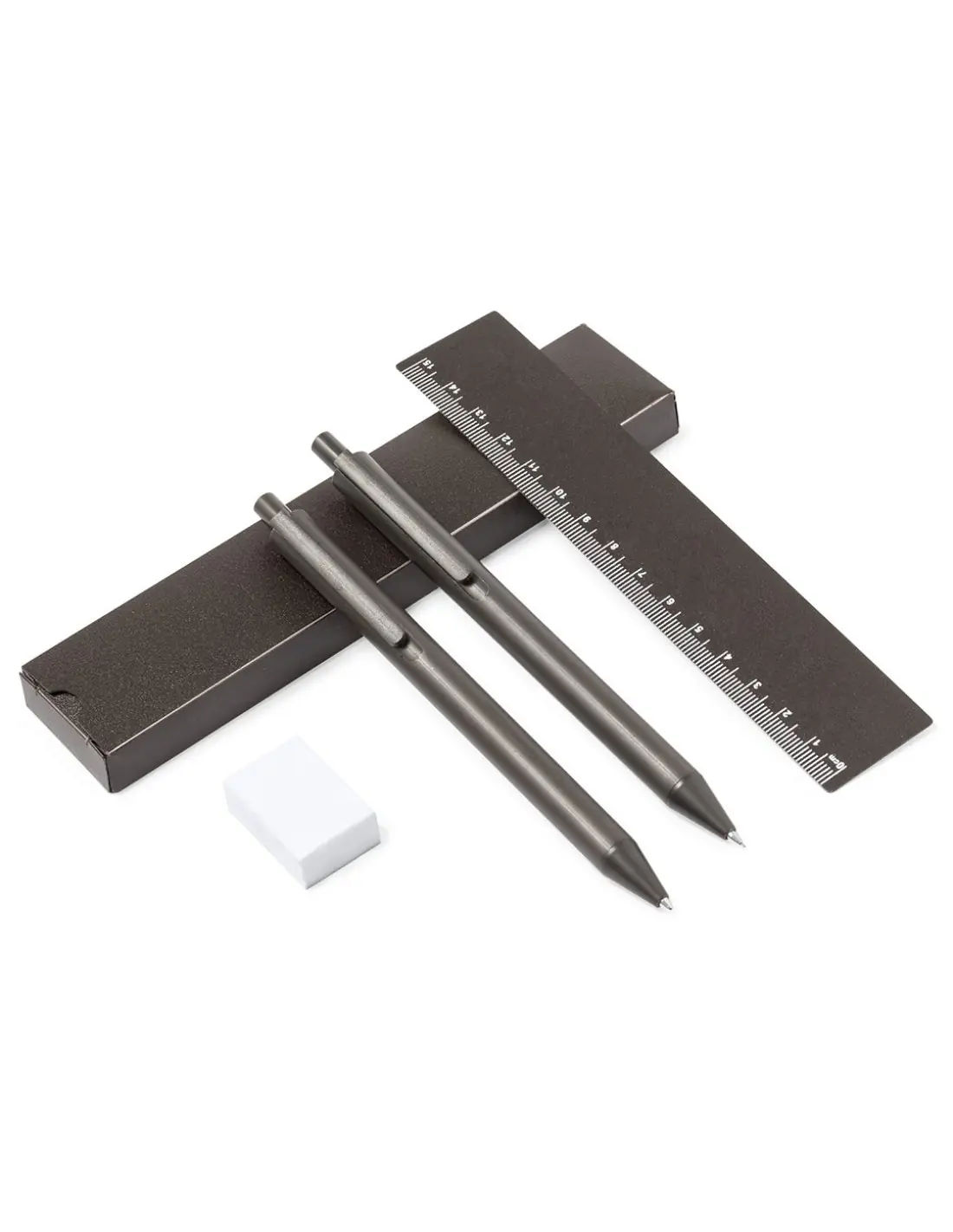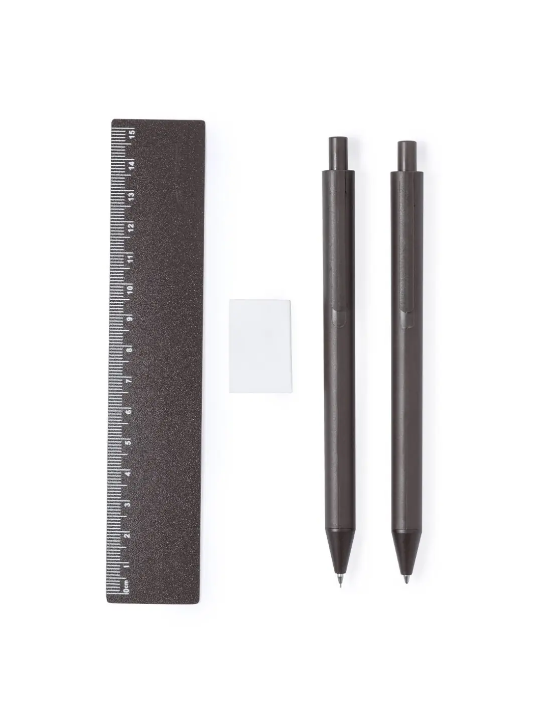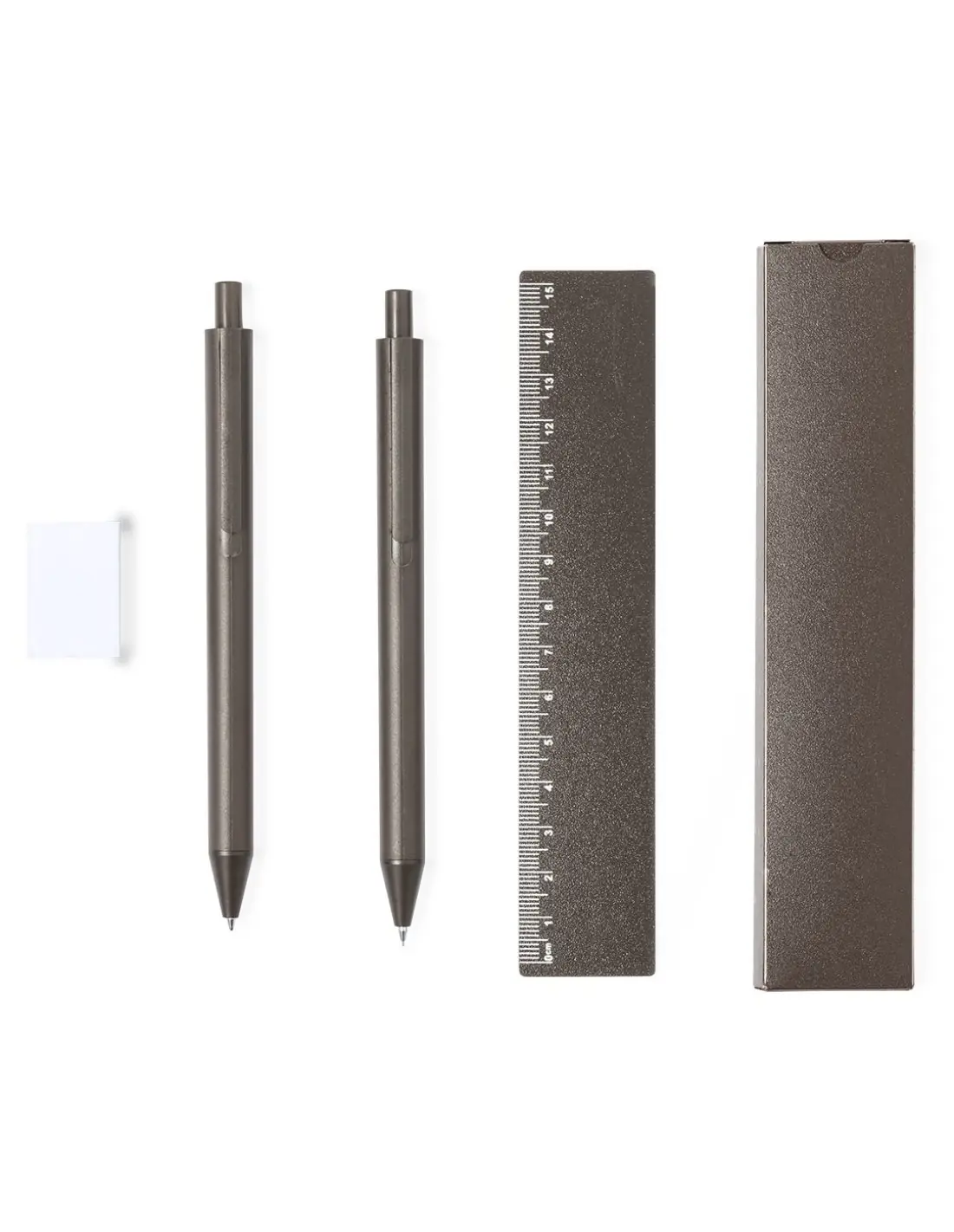 Set de bolígrafo, portaminas y regla, fabricados en fibra de café. Bolígrafo en tinta azul y portaminas con 2 minas incluidas de 0,7mm, ambos con clip. Incluye una práctica regla de 15 cm y útil goma. Presentado en estuche individual de fibra de café. Logotipo fibra de café en la parte superior del bolígrafo y portaminas.La fibra de café es una solución circular que se obtiene de la utilización de los residuos producidos en la obtención del café. Una alternativa sostenible que favorece la reducción del uso de plásticos, ahorrando energía en su proceso de fabricación y contribuyendo al cuidado del medio ambiente.