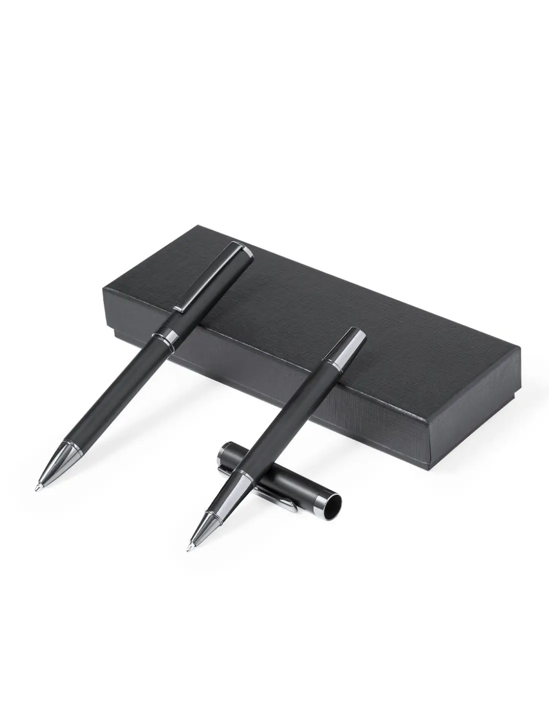 Elegante set de bolígrafo y roller. Bolígrafo de mecanismo giratorio y roller con capucha, ambos provistos de un clip metálico. Con tinta azul, su cuerpo presenta un elegante acabado negro mate y sutiles detalles cromados. Presentados en un estuche kraft negro, con interior troquelado en tacto de terciopelo.