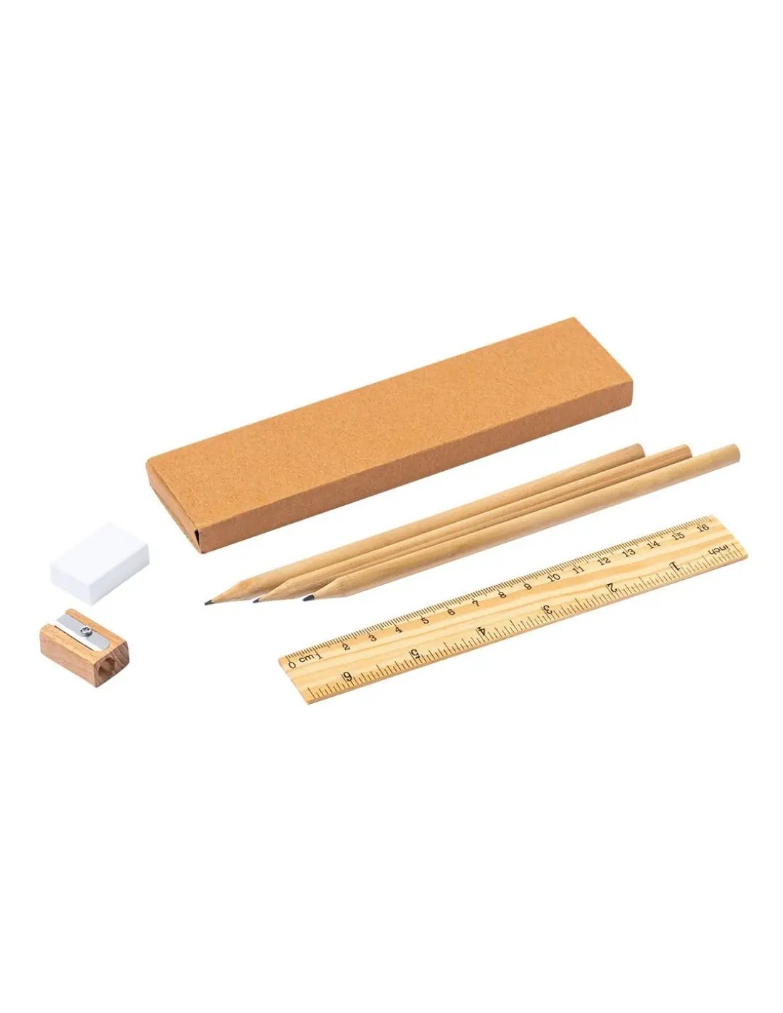 Set de 6 piezas con 3 lápices de madera con cuerpo redondo de acabado natural y mina negra, regla de 20cm con sistema métrico en centímetros/pulgadas, goma de borrar y sacapuntas. Presentado en estuche de cartón reciclado.