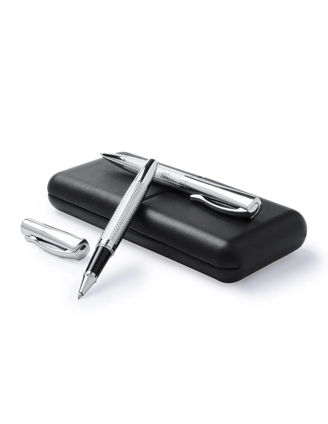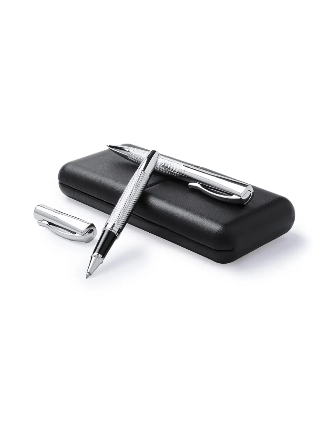Elegante set de bolígrafo de mecanismo giratorio y roller de capucha en sobrio diseño. De cuerpo metálico antideslizante en acabado plateado brillante con clip a juego. Presentado en elegante y original estuche individual de polipiel en color negro con interior troquelado en suave antelina blanca. De cartucho jumbo con tinta azul de calidad alemana.
