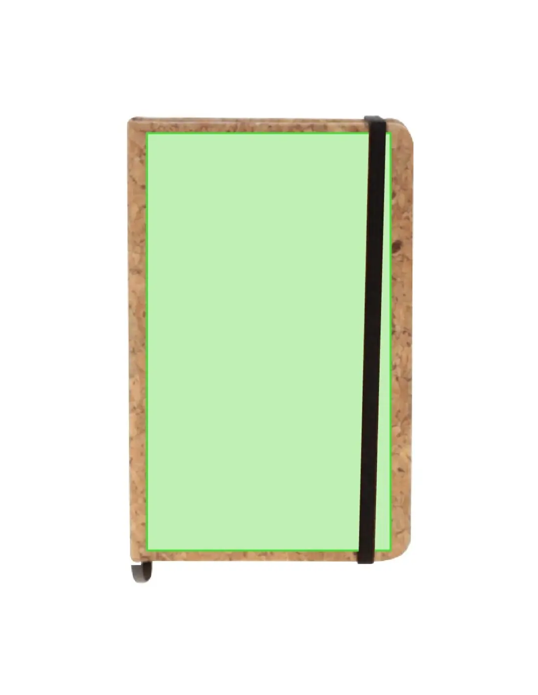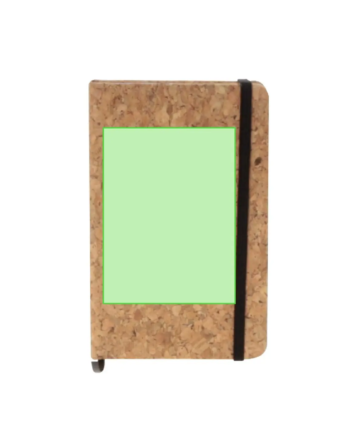 Bloc de notas con tapas de suave tacto acabadas en corcho natural. De 80 hojas lisas, con elástico de sujeción y marcapáginas de tela a juego.