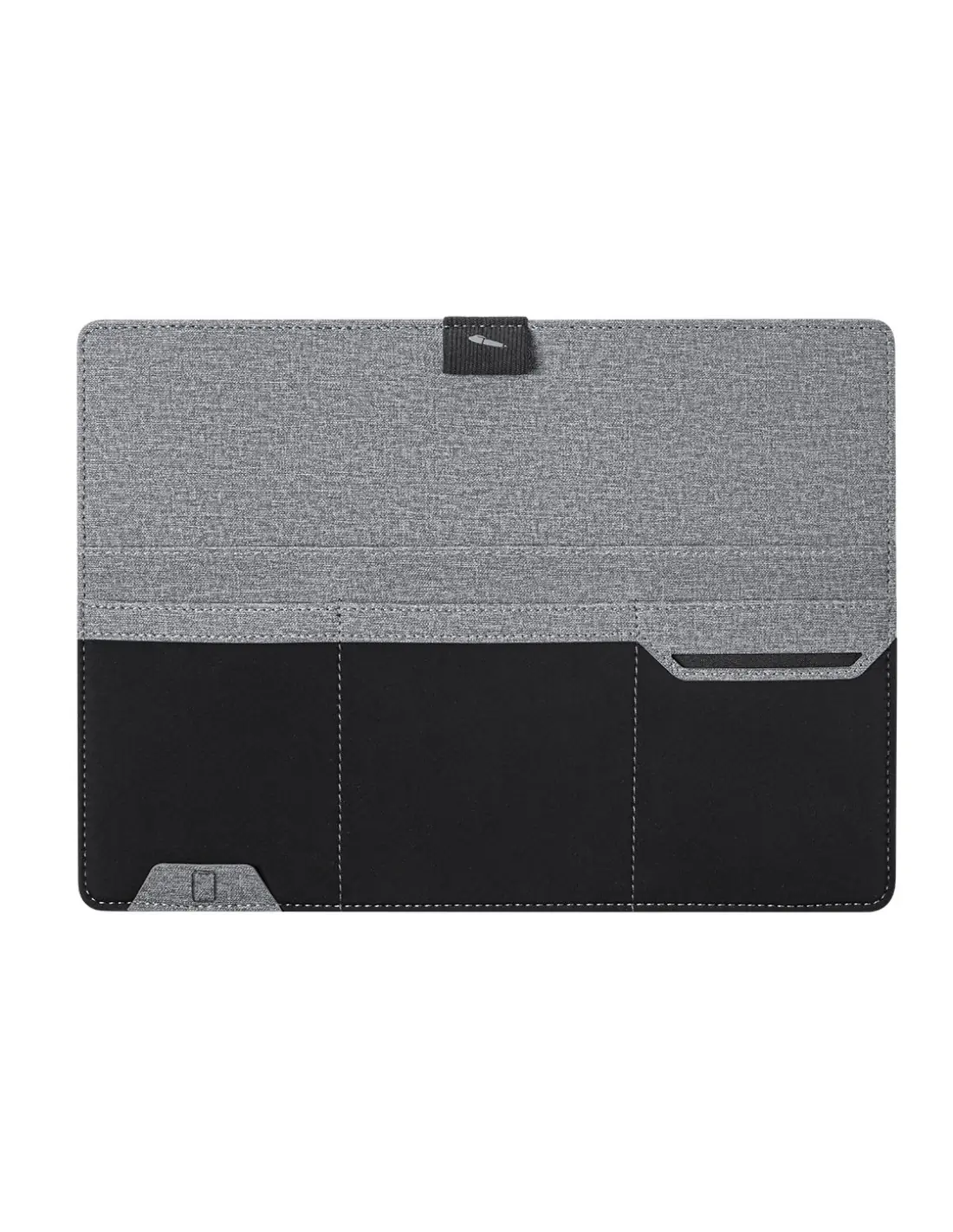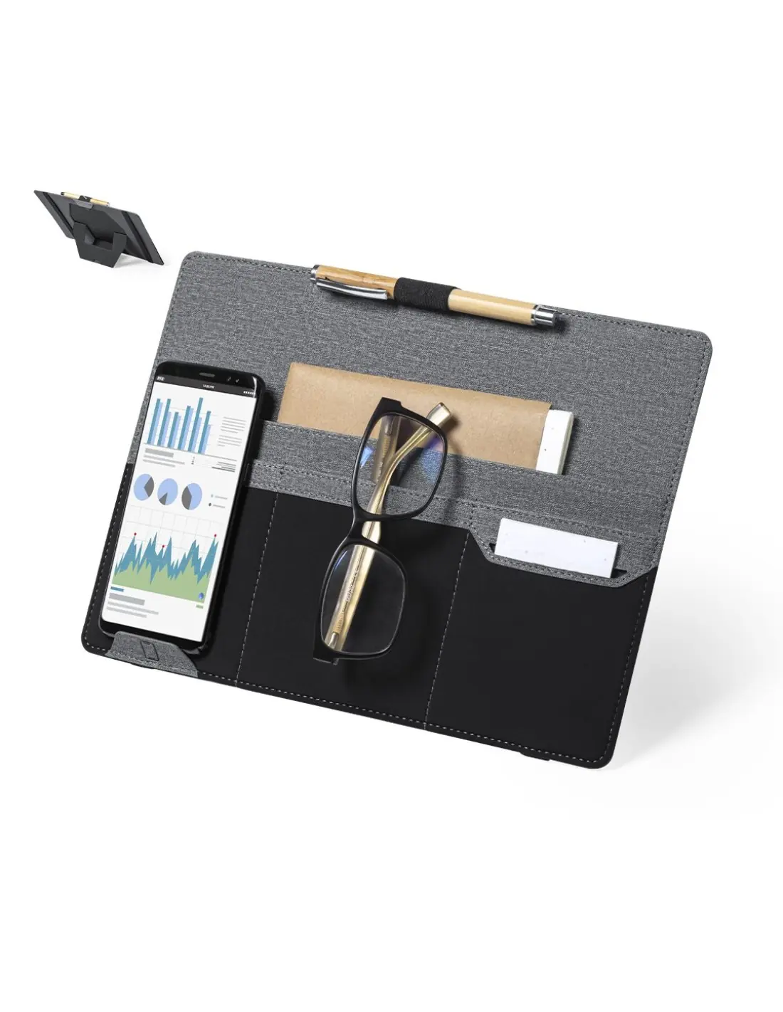 Elegante y práctico organizador con soporte imantado, ideal para facilitar el trabajo o uso de portátil en cualquier lugar o espacio. Fabricado en resistente poliéster gris jaspeado con detalles en polipiel de color negro. Incluye soporte para bolígrafo y smartphone, con 4 bolsillos elásticos para el almacenamiento de diferentes gadgets.