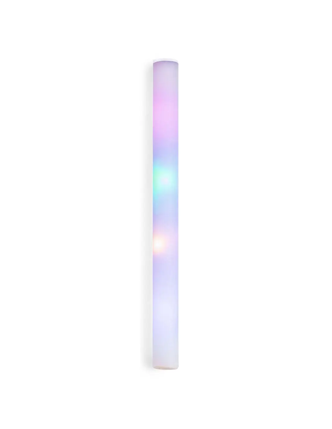 Original barra de luz, iluminada por brillantes LEDs. Fabricada en espuma de tacto suave y agradable, el interior se ilumina gracias a cuatro luces LEDs de variados colores. Alimentada por pilas de botón incluidas, su encendido resulta sencillo mediante un botón en la base con tres posiciones distintas (luz fija, luz intermitente rápida o lenta). Este accesorio es ideal para destacar en cualquier evento. Presentado individualmente en una caja diseño kraft.