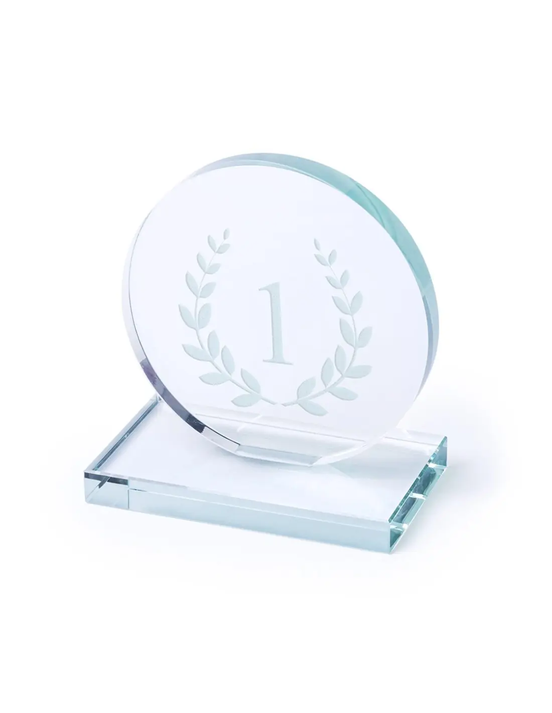 Placa trofeo de grueso cristal con elegante diseño circular y base cuadrada. Especialmente diseñada para marcaje a láser y presentada en estuche de protección individual.