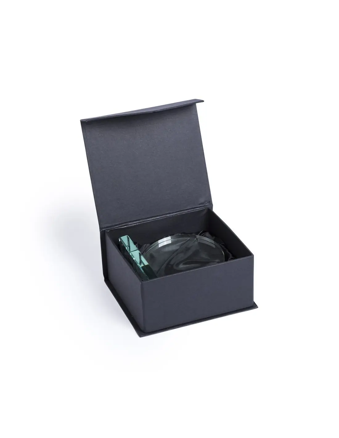 Placa trofeo de grueso cristal con elegante diseño circular y base cuadrada. Especialmente diseñada para marcaje a láser y presentada en estuche de...