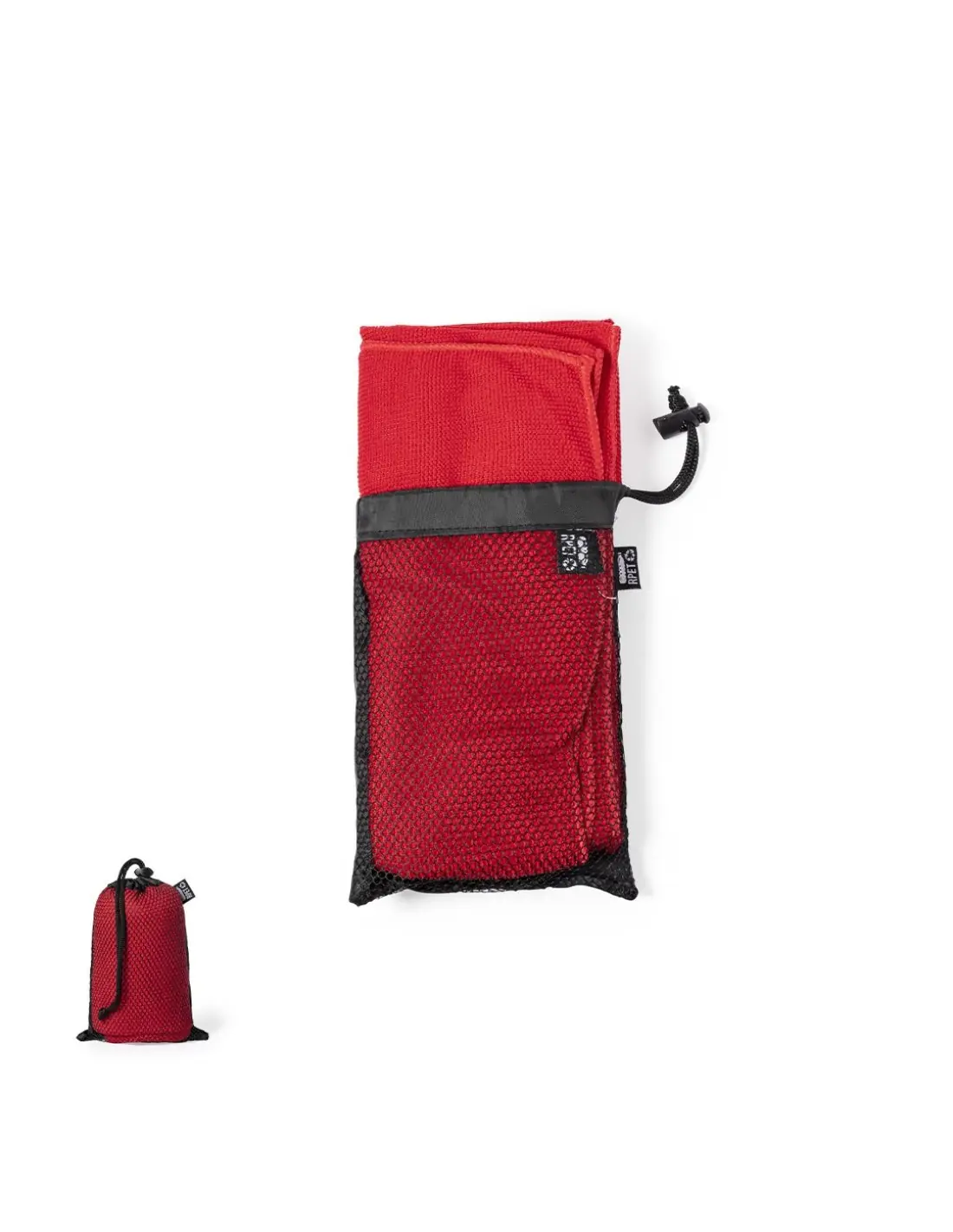 Toalla absorbente de línea nature. Fabricada en RPET de 160g/m2, elaborado a partir de plástico reciclado para así fomentar la reutilización de residuos plásticos y contribuir a la sostenibilidad del planeta. Tamaño 50x100 cm, presentada en funda individual de redecilla RPET con parte trasera lisa y disponible en variada gama de colores. Con distintivo RPET en etiqueta.