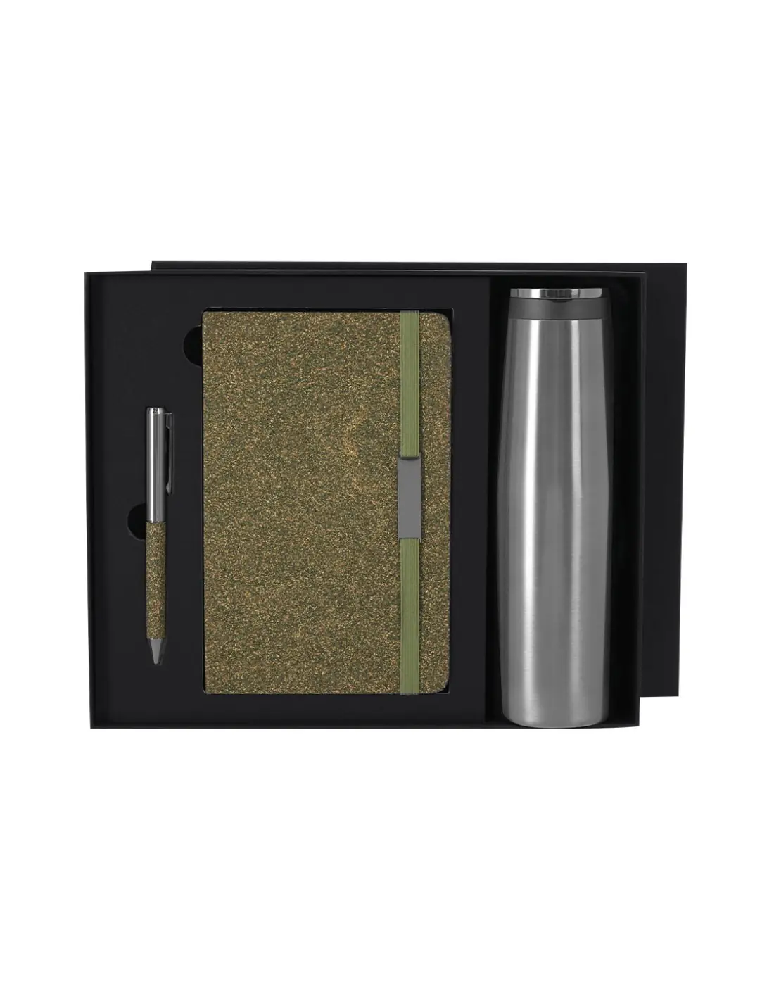 Set de bloc de notas y bolígrafo confeccionados con Fibra de Té, además de un bidón térmico fabricado en acero inox.El set incluye:- Bloc de notas de tapas rígidas, con 80 páginas rayas, banda elástica con clip metálico y marcapáginas a juego. - Bolígrafo de aluminio en acabado cromado con empuñadura de Fibra de Té, mecanismo giratorio y tinta azul. - Bidón térmico de doble pared fabricado en acero inox de 500ml. Con tapón a rosca y asa metálica. Bloc con logo Tea Grounds marcado en la parte posterior. Presentado de manera elegante en una caja negra con interior troquelado. Tea Grounds es un material sostenible creado a partir de residuos de hojas de té recicladas. Durante el procesamiento del té, se recolectan y compactan los restos para darles una segunda vida como recurso útil. Su producción fomenta la economía circular y reduce el impacto ambiental.