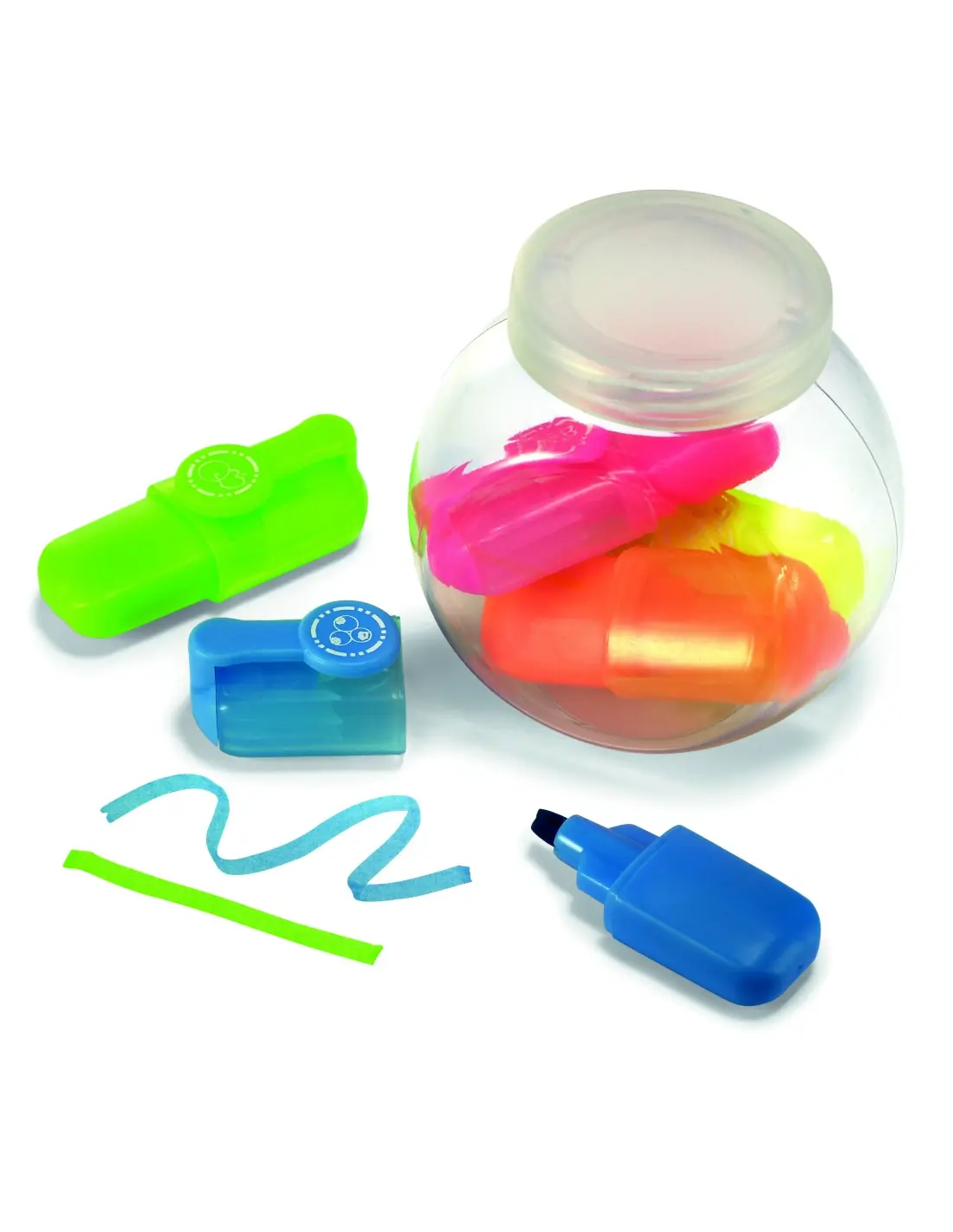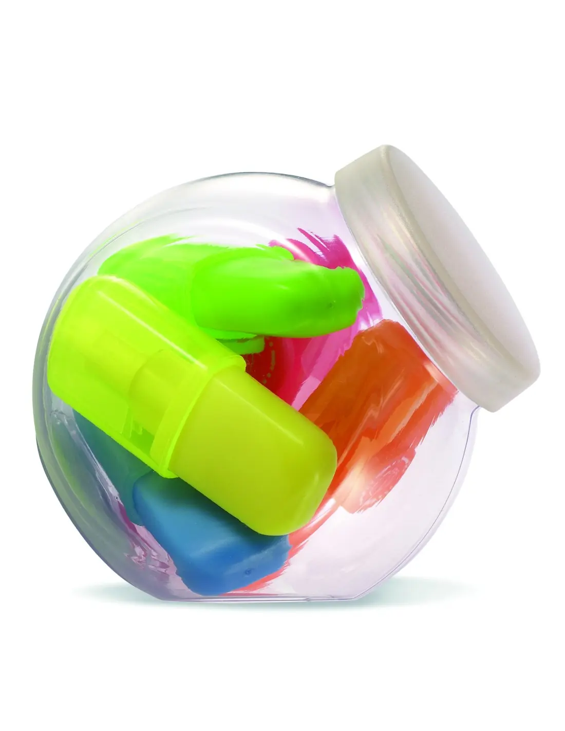 5 marcadores presentados en un pequeño bote transparente de PET.