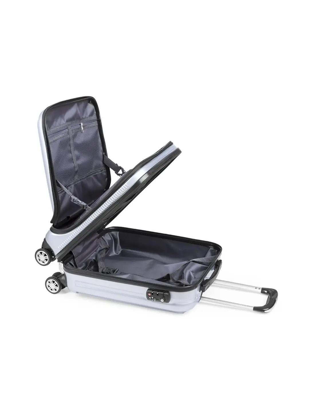 Trolley de negocios rígido en resistente material en acabado plateado. De apertura total, con 4 ruedas giratorias y cierre de seguridad por contraseña. Cierre conforme a los estándares TSA -Administración de la Seguridad en el Transporte-, que permite a las autoridades de aduanas inspeccionar el contenido del equipaje sin tener que forzar o romper el cierre, a traves de una llave especial a disposición de la autoridad. Compartimento principal con cierre de cremallera de doble tirador y doble asa de mano. Interior forrado, con bolsillo acolchado para ordenador portátil de hasta 17 pulgadas.