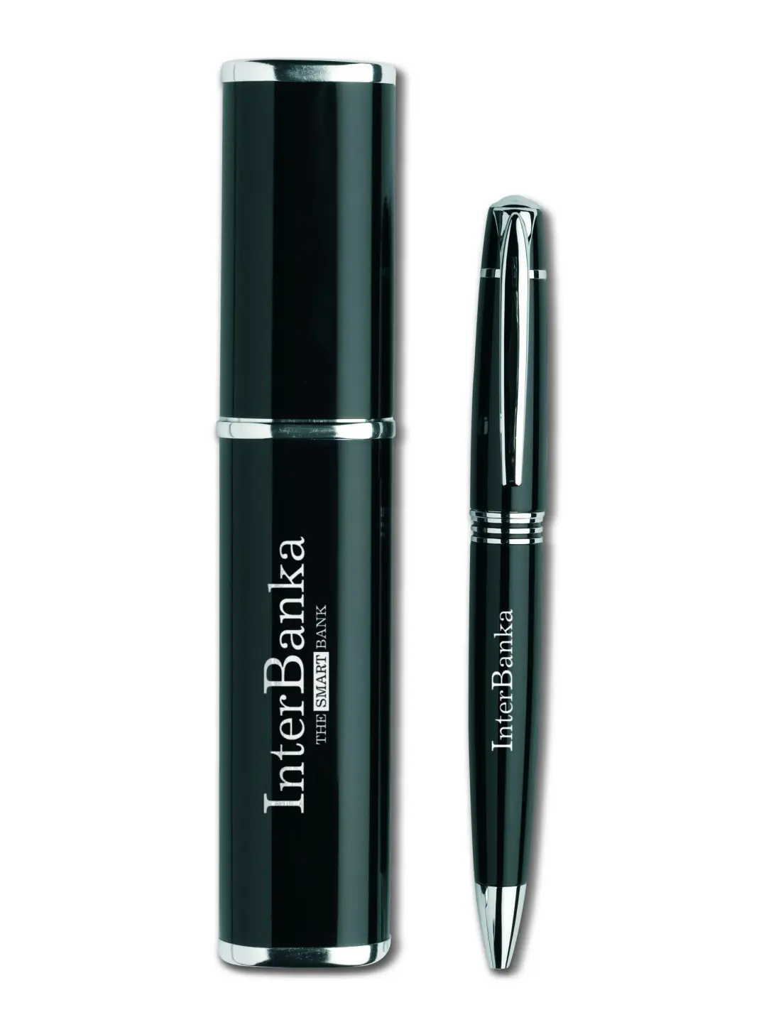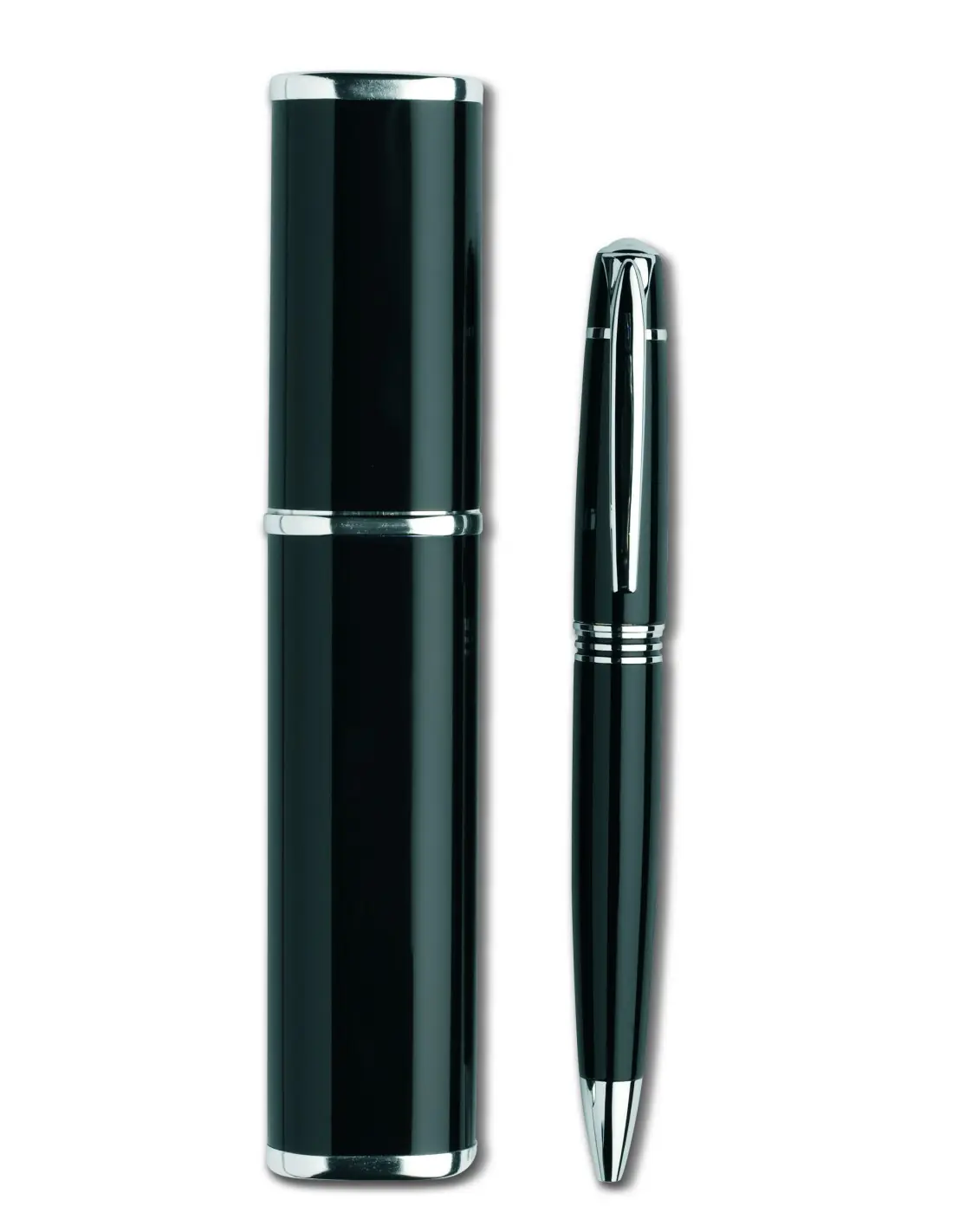 Bolígrafo giratorio de metal en caja de regalo de aluminio. Mina de metal con tinta negra.