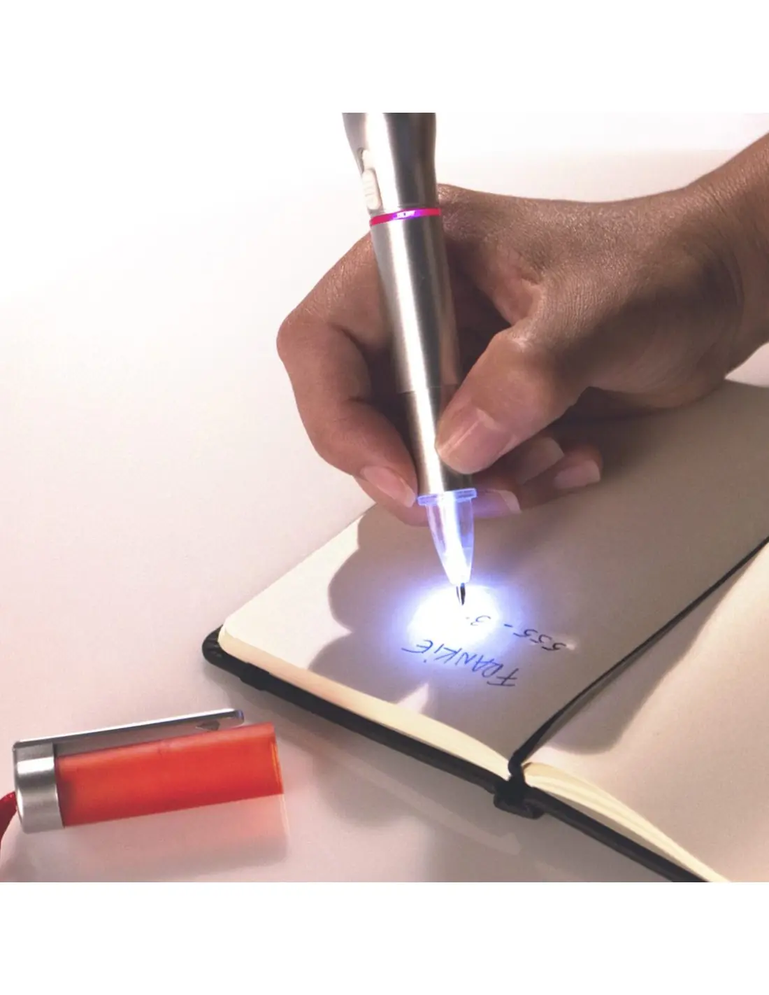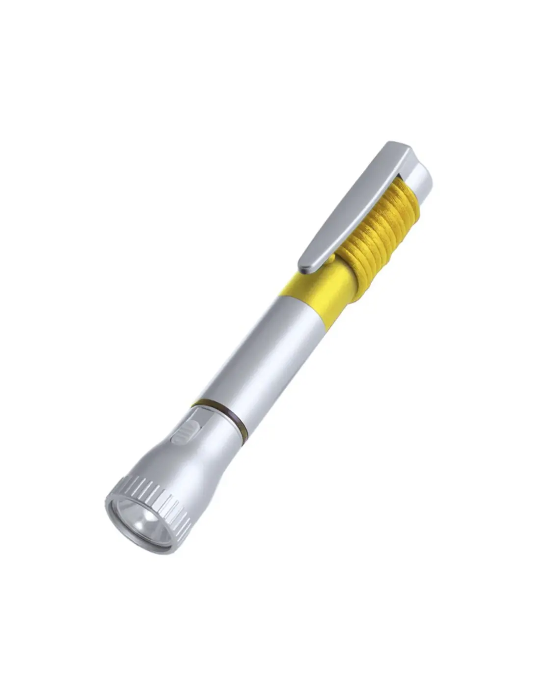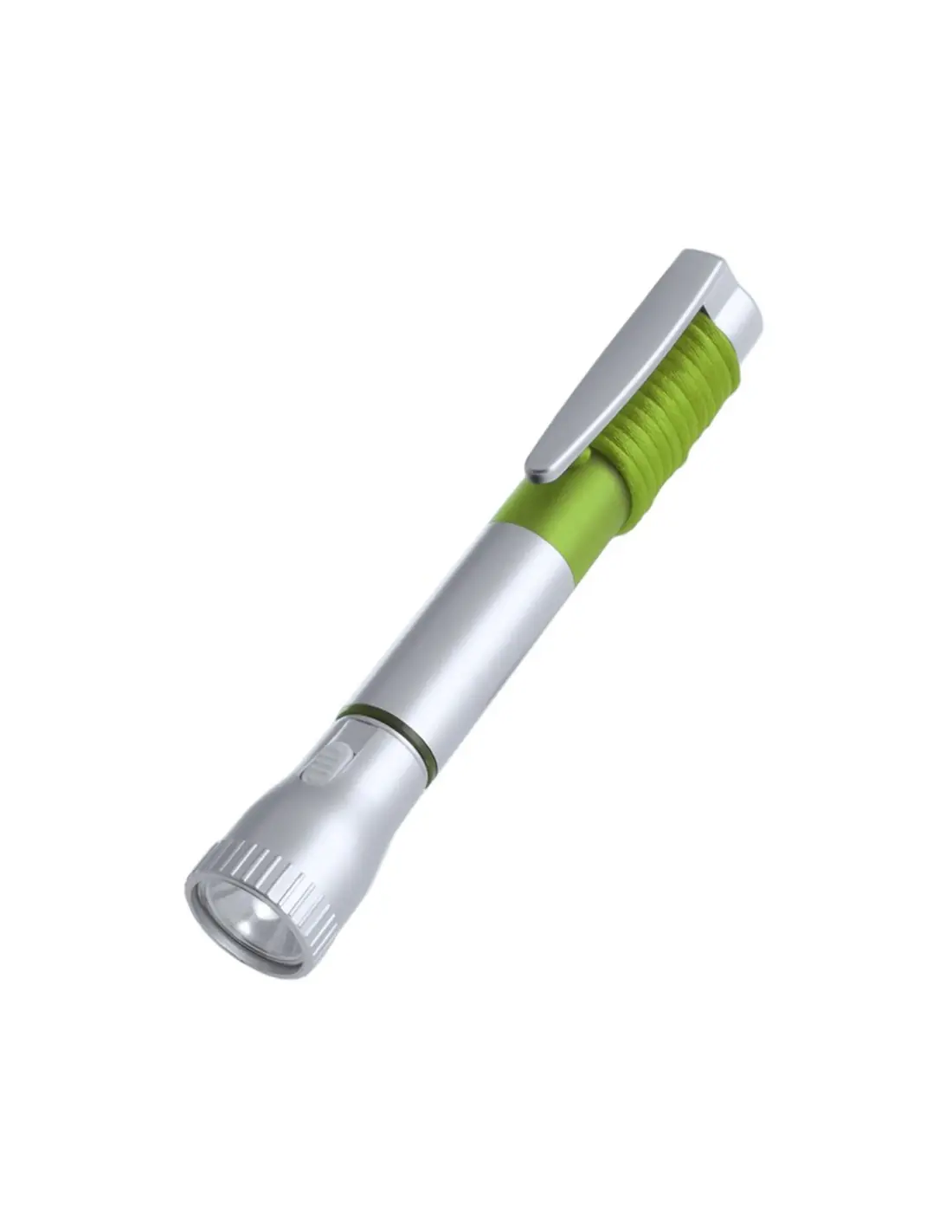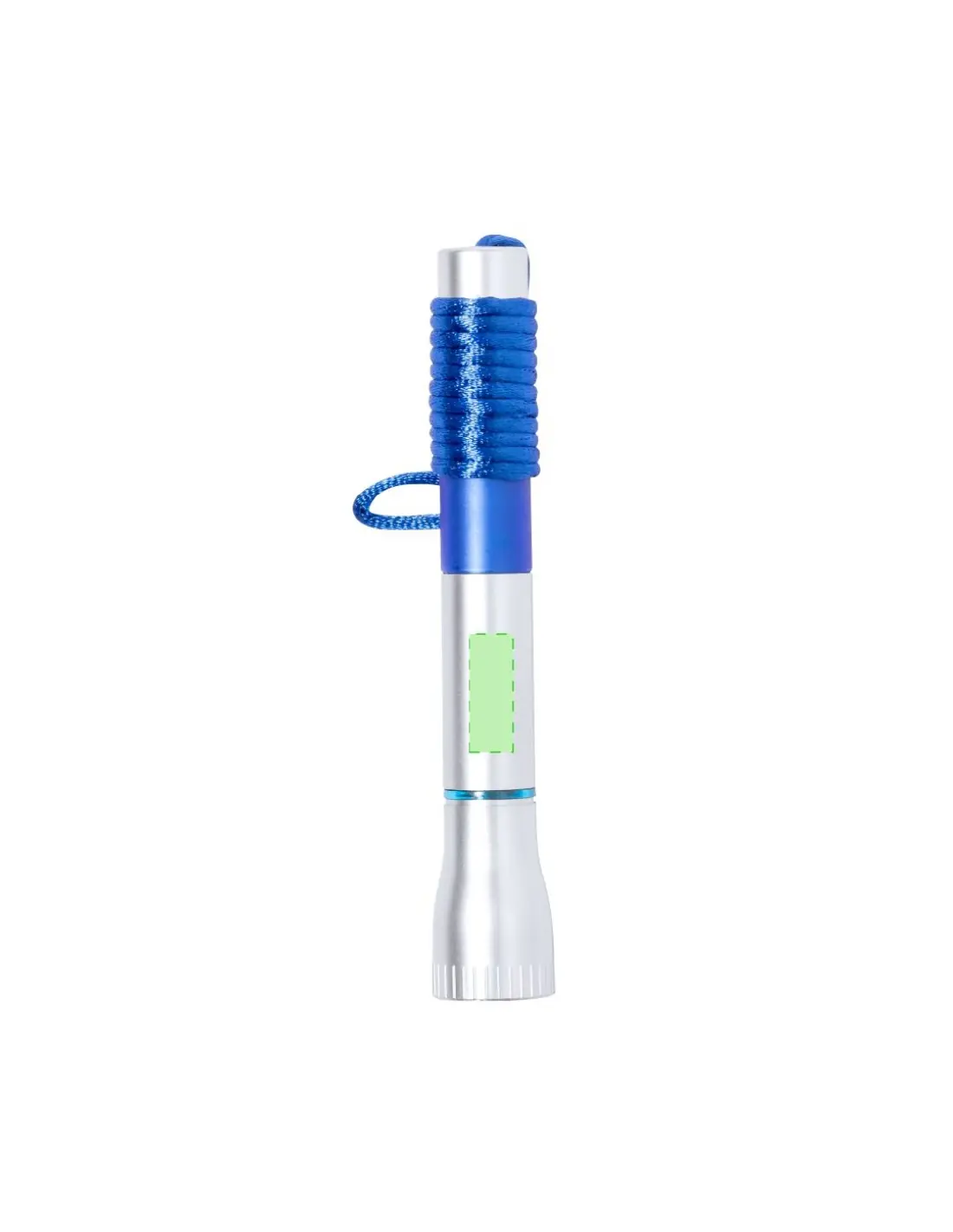 Boligrafo con linterna led integrada. De original diseño bicolor y cuerpo en suave acabado de color plateado. Capucha translúcida en vivos colores con cinta de transporte a juego. En tinta azul y con pilas de botón incluidas.