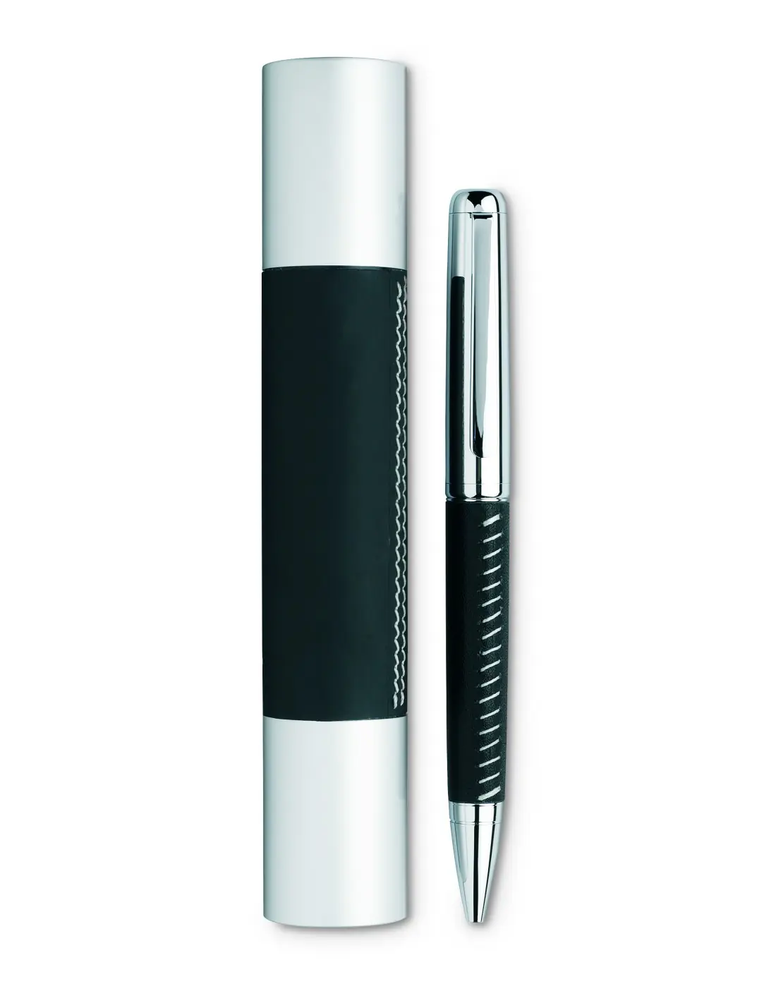 Bolígrafo metálico con acabado cromado plateado y aplicación en piel en caja de tubo de aluminio. Tinta negra.