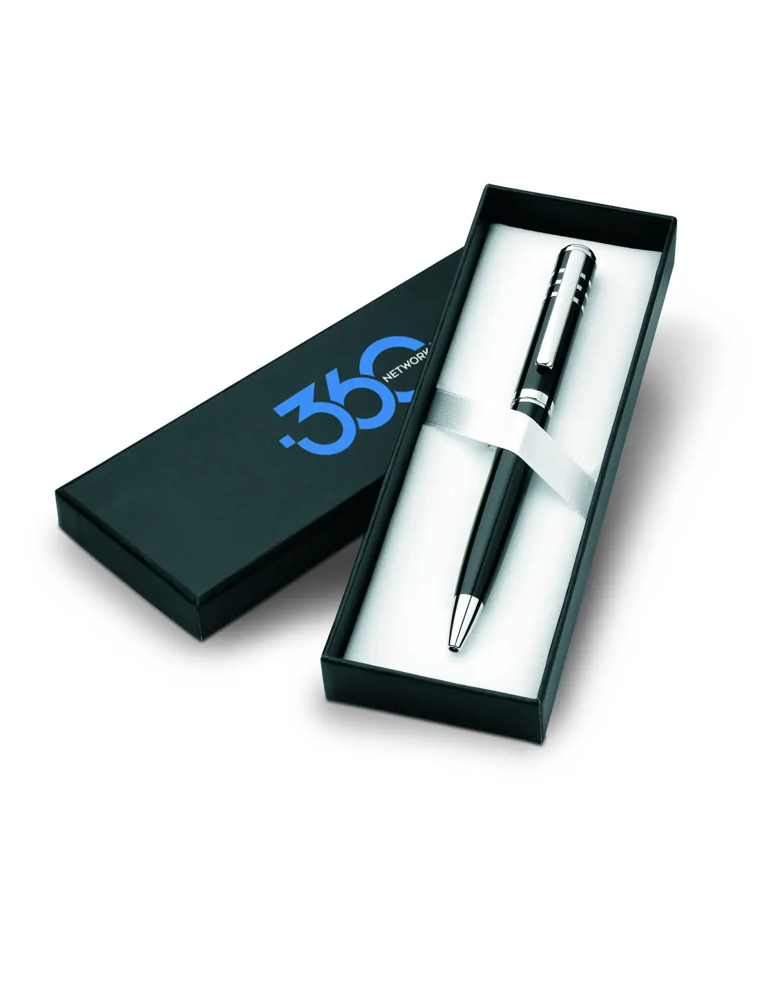 Bolígrafo metálico en acabado brillante. Se presenta en una caja de regalo de cartón. Tinta negra.