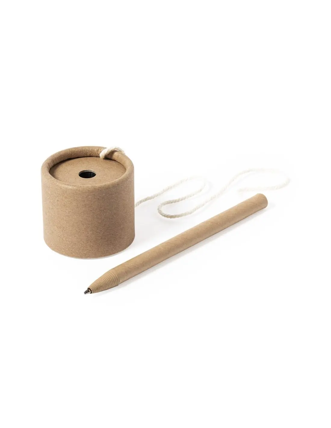 Bolígrafo con soporte de línea nature. Fabricado en cartón reciclado, con cuerda de sujeción y base con adhesivo 3M, de fijación extra fuerte y libre de residuos al despegarlo. En tinta azul.