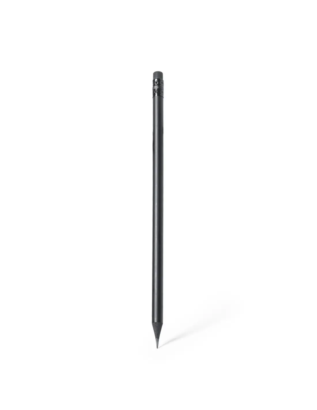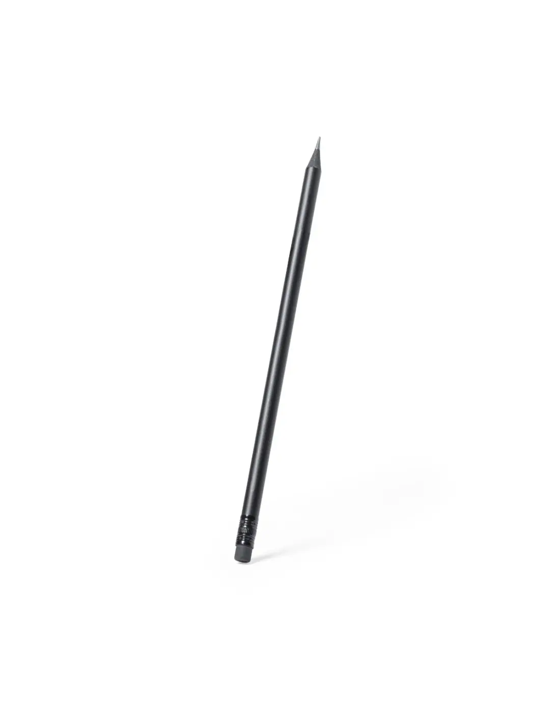 Lápiz de madera natural en acabado negro mate. Con goma de borrar, mina negra y punta afilada.