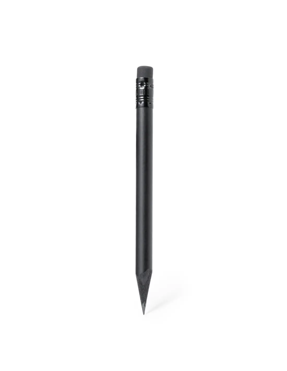 Lápiz de madera natural en acabado negro mate, con mina negra, punta afilada y goma en la parte superior a juego.