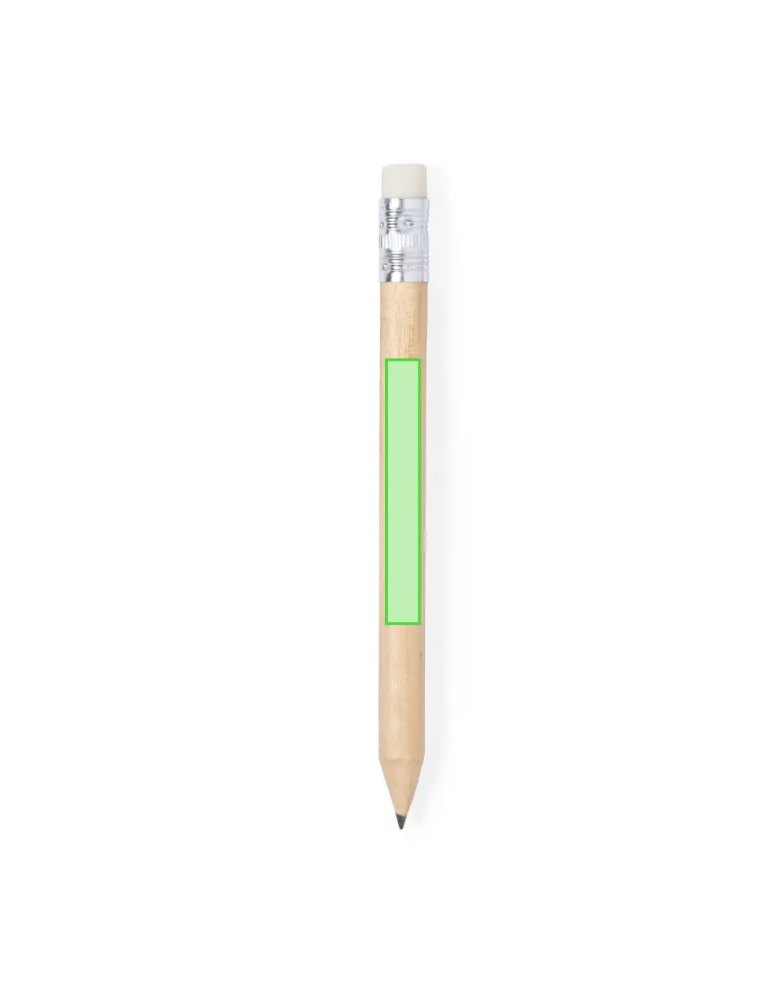 Minilápiz de madera de acabado natural. Con cuerpo redondo y goma de borrar en color blanco. Mina negra y punta afilada.