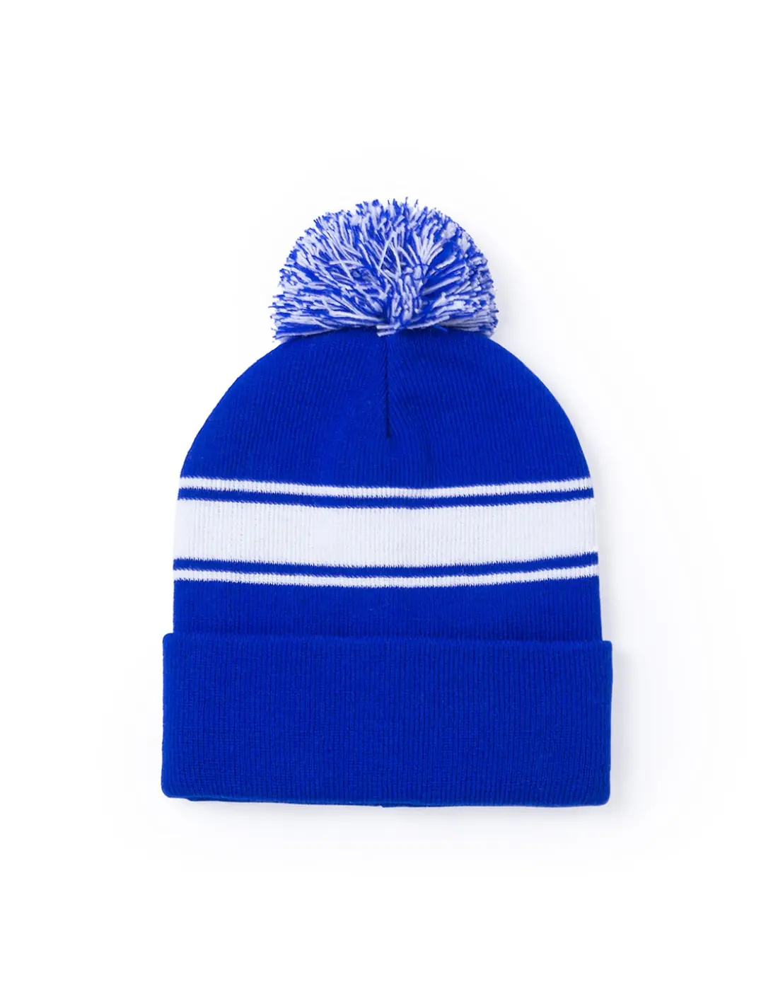 Suave y cálido gorro de material acrílico en variada gama de colores. De original diseño, con tira frontal de color blanco y pom pom bicolor a juego.