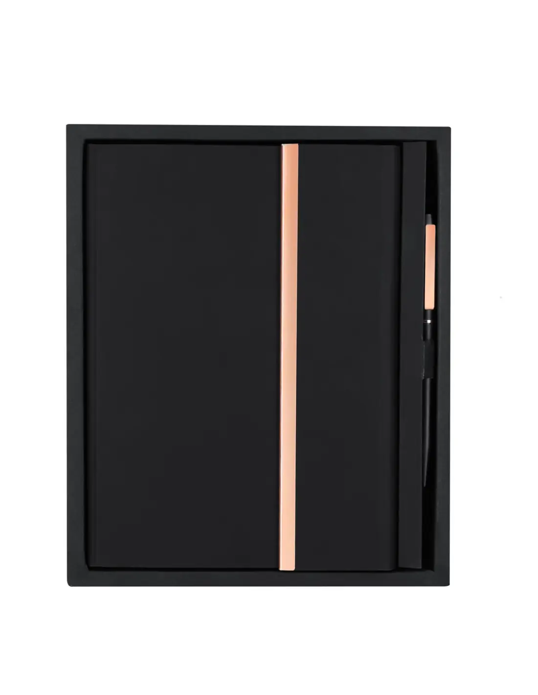 Set de bloc de notas y bolígrafo fabricados en PU Reciclado y Aluminio Reciclado. En elegante negro mate y con distinguidos accesorios en acabado oro rosa. El set incluye: - Bloc de notas fabricado en PU Reciclada y elegante detalle en oro rosado, con tapas rígidas y sistema de cierre imantado. Incluye 80 páginas de color crema con líneas, un marcapáginas a juego y soporte para bolígrafo. Con distintivo PU Reciclada. - Bolígrafo de aluminio reciclado, con cuerpo en color negro mate y detalles en acabado oro rosa. Dispone de clip metálico, mecanismo giratorio y tinta azul. Incluye distintivo de aluminio reciclado. Todo el conjunto se presenta en un elegante estuche negro.La PU Reciclada destaca por su resistencia y elasticidad. Este material reciclado y reciclable es una opción sostenible que rescata las fibras desechadas en los procesos de fabricación, minimizando así el desperdicio de material y contribuyendo a su vez a reducir el impacto ambiental, manteniendo a la vez sus propiedades originales.El Aluminio Reciclado es un material con posibilidades de reciclaje casi infinitas, sin perder sus propiedades originales y consumiendo menos energía en este proceso.Certificación GRS (Global Recycled Standard / Estándar de Reciclaje Global), que garantiza el origen reciclado del material usado para fabricar el producto.