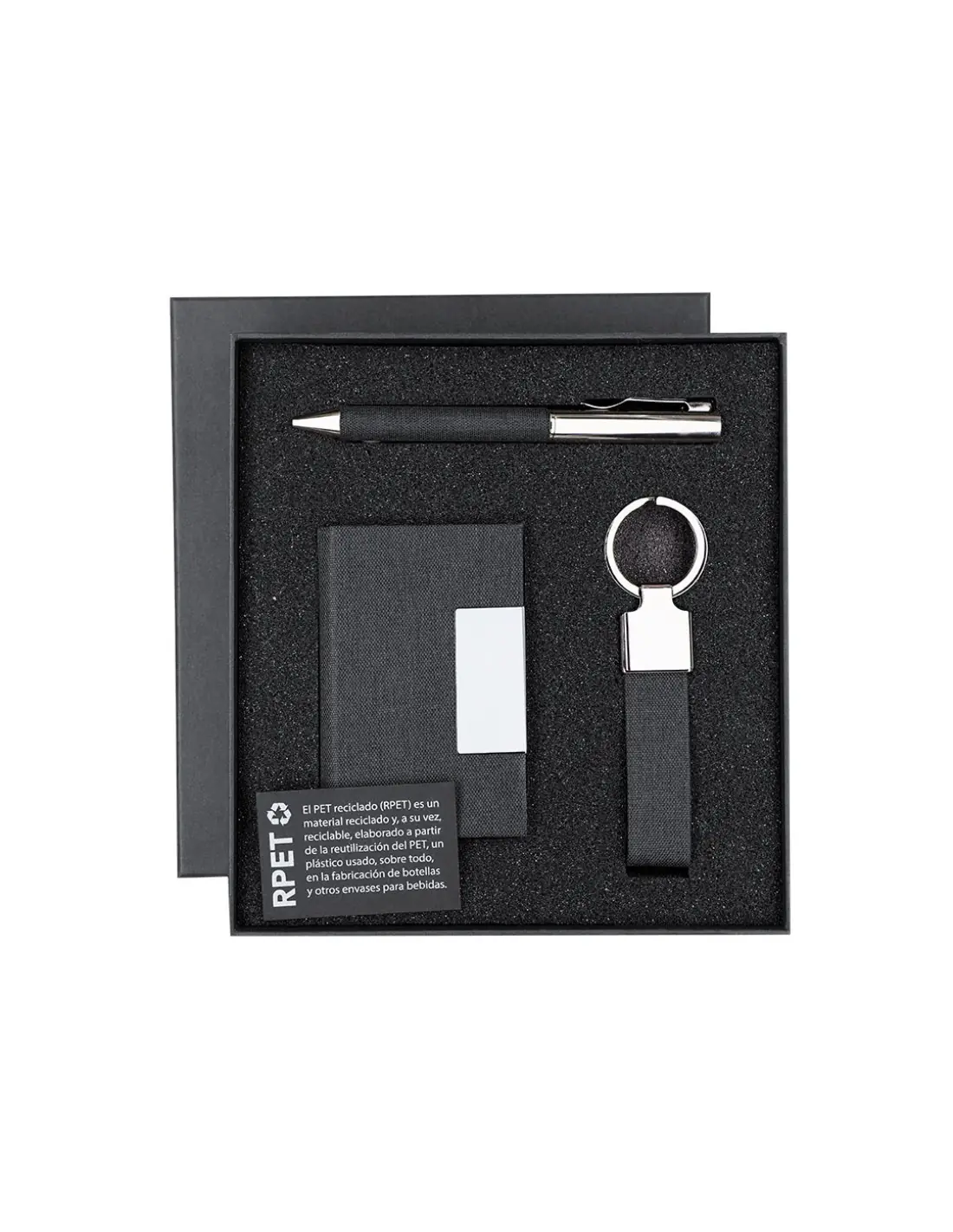 Elegante set en RPET con acabado negro bitono y detalles metálicos. Incluye:-Tarjetero de RPET con exterior negro bitono combinado y detalle metálico, 1 compartimento interior y sistema de cierre magnético.-Bolígrafo de RPET de acabado negro bitono y detalles metálicos. Con mecanismo giratorio y tinta azul.-Llavero en RPET de acabado color negro bitono y accesorios cromados.Presentado en estuche individual negro. Incluye tarjeta negra interior con distintivo RPET.El material RPET se elabora a partir de plástico reciclado, para así fomentar la reutilización de residuos plásticos y ayudar a la sostenibilidad del planeta.