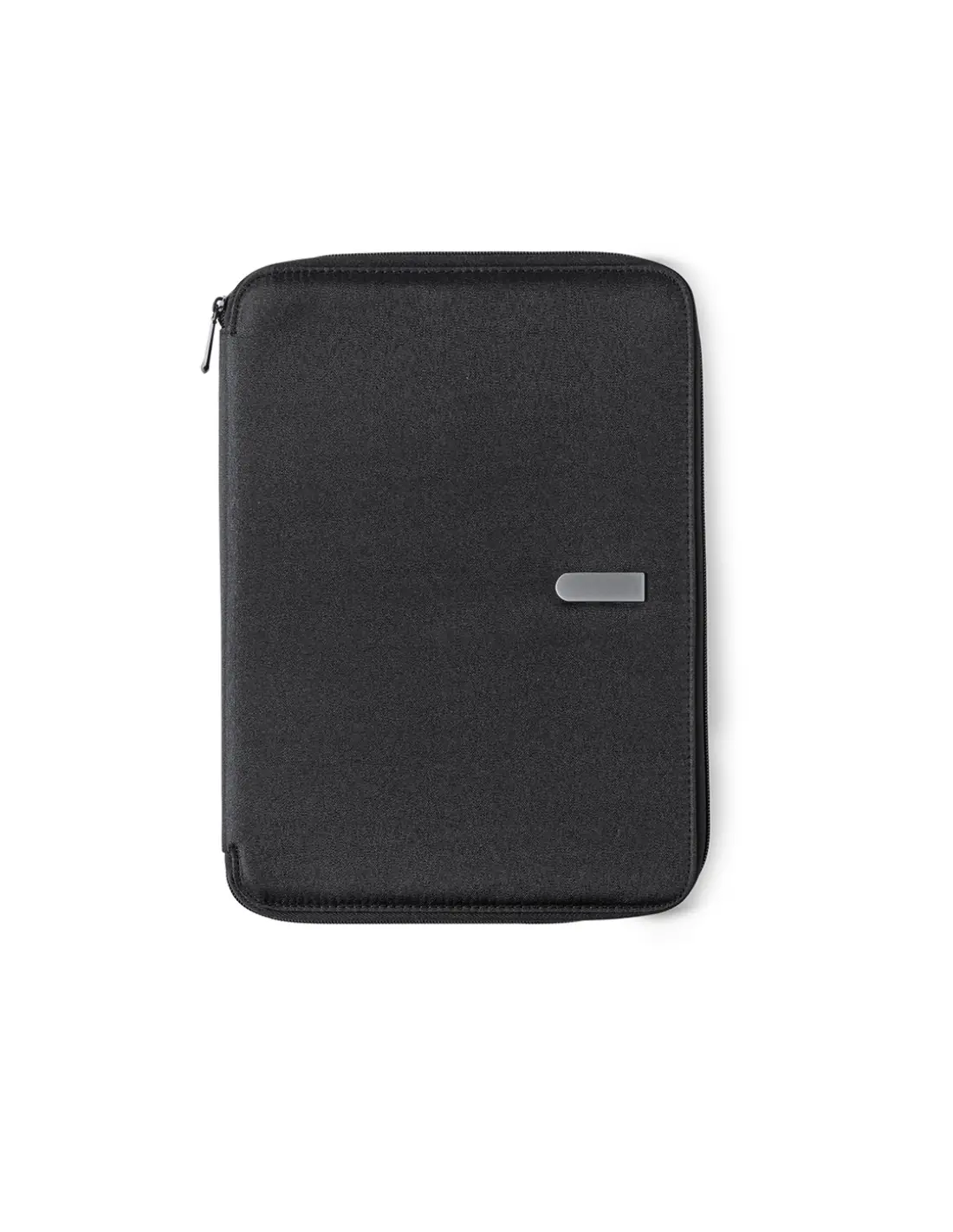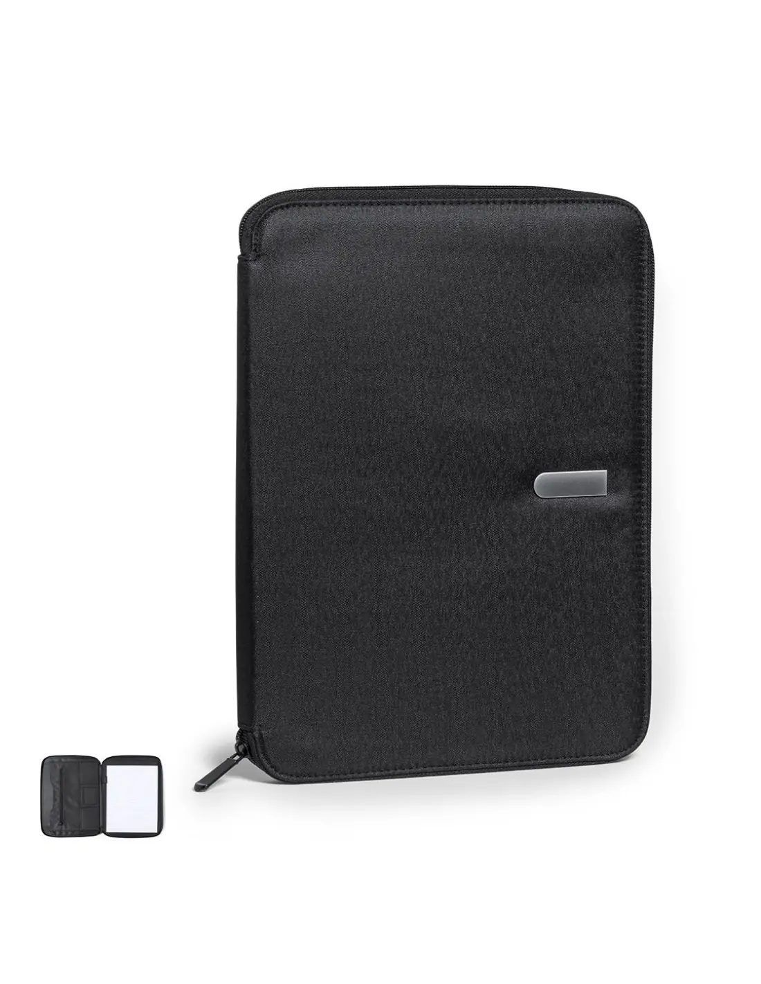Elegante portadocumentos de cierre de cremallera acabado en suave microfibra. Interior con bloc extraíble de 20 hojas de distribución a una raya, bosillo de cremallera, bolsillo solapa, tarjeteros y soporte para bolígrafo. Con elegante chapa metálica en frontal para marcaje en láser.