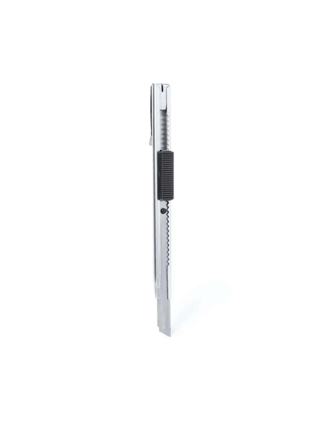 Cutter de acero inox con cuchilla fina y clip de fijación. Capucha extraíble para ajuste de corte de cuchilla.
