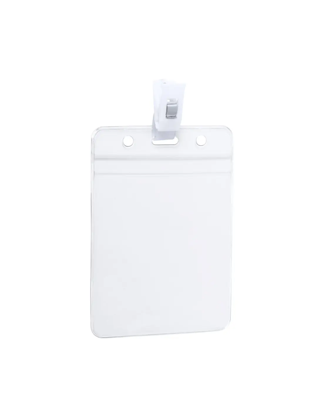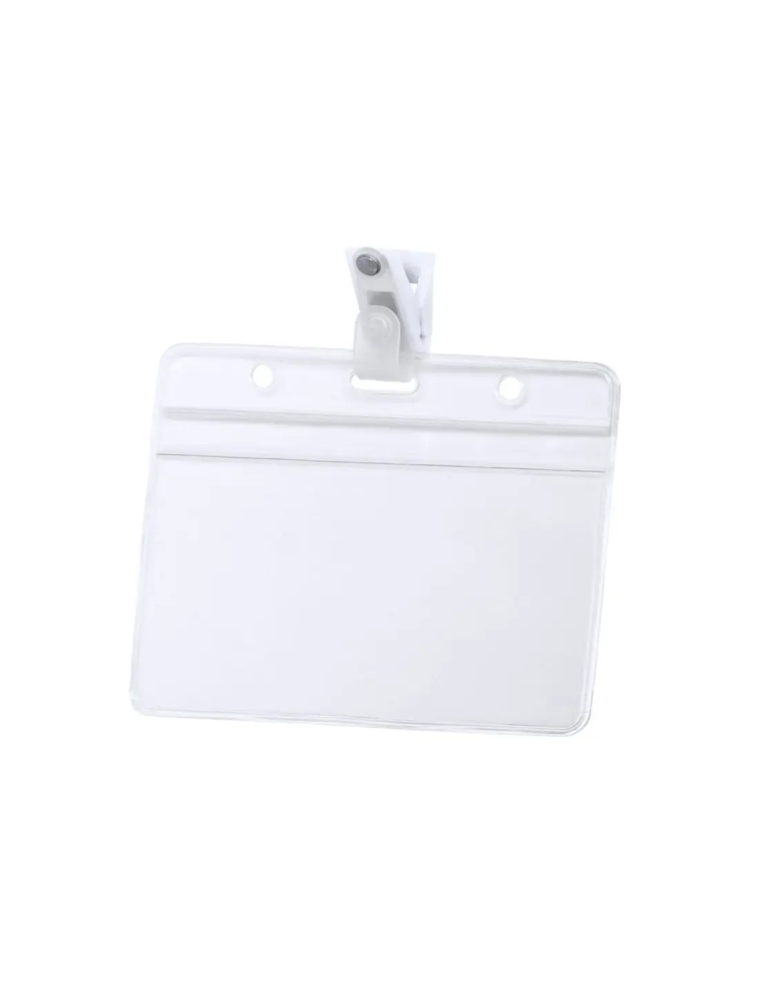 Identificador troquelado en PVC con clip de fijación en color blanco. Disponible en diseño horizontal y vertical.