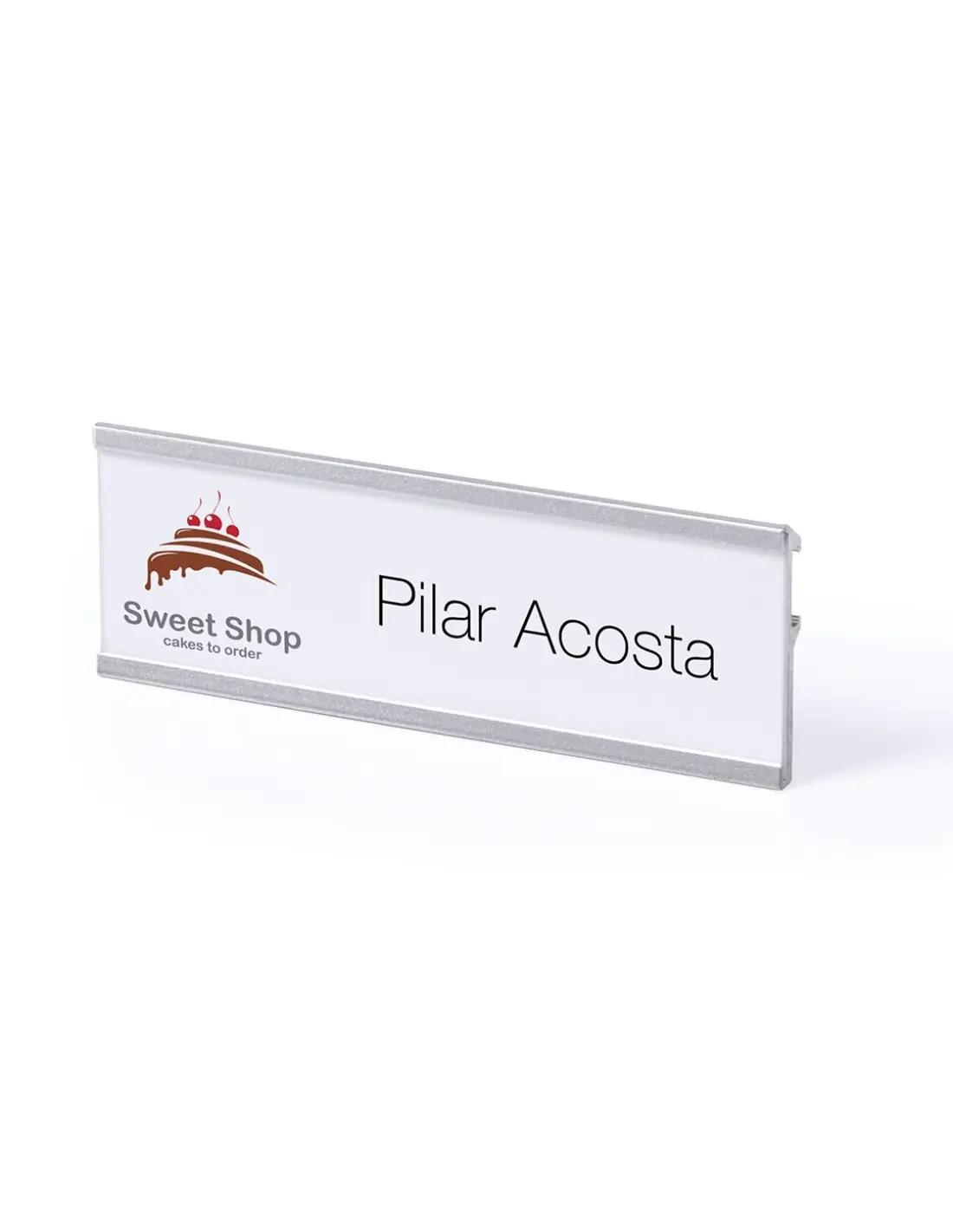 Identificador con marcos de aluminio en acabado anodizado. Parte trasera con pinza de enganche para una fijación segura.